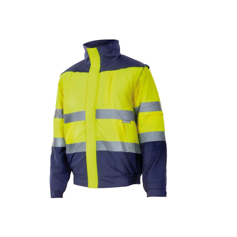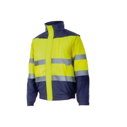 Fermeture zippée avec rabat et Velcro®. Imperméable. Bandes réfléchissantes sur le torse et les manches. Capuche cachée dans le col. Intérieur du cou en polaire. Manches amovibles. Taille élastiquée avec réglage sur le côté. Poignets élastiqués et ajustables par Velcro® . 5 poches : Poche poitrine passepoilée. 2 poches frontales passepoilées. Poche sur la manche. Poche intérieure zippée.