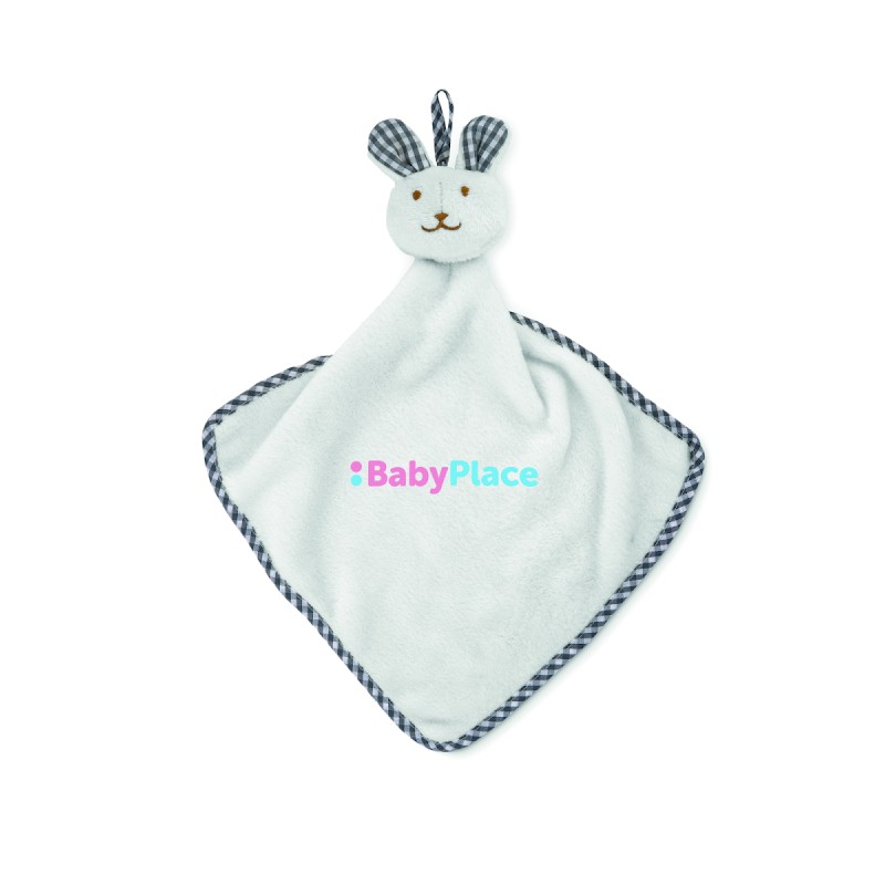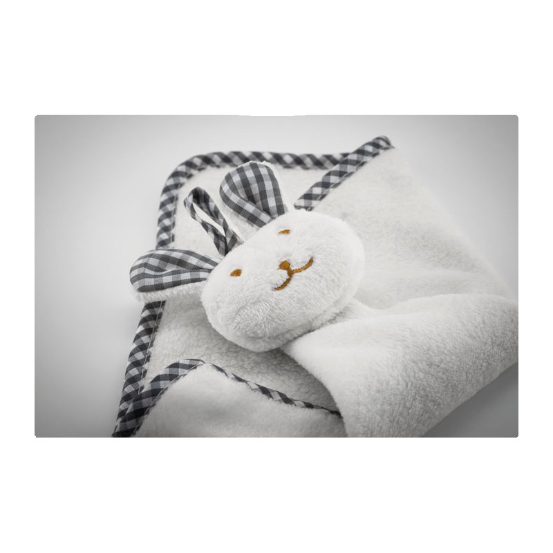 Serviette bébé en peluche en polyester velours avec lapin sur le dessus. 180gr/m².