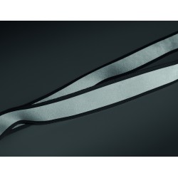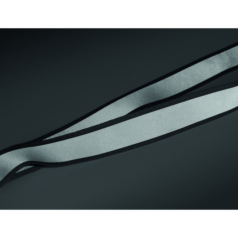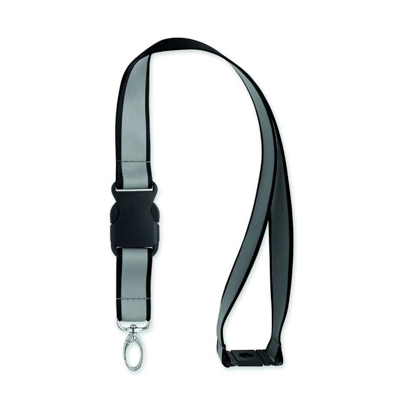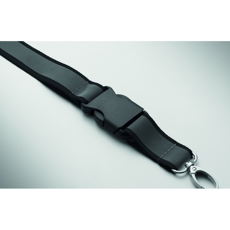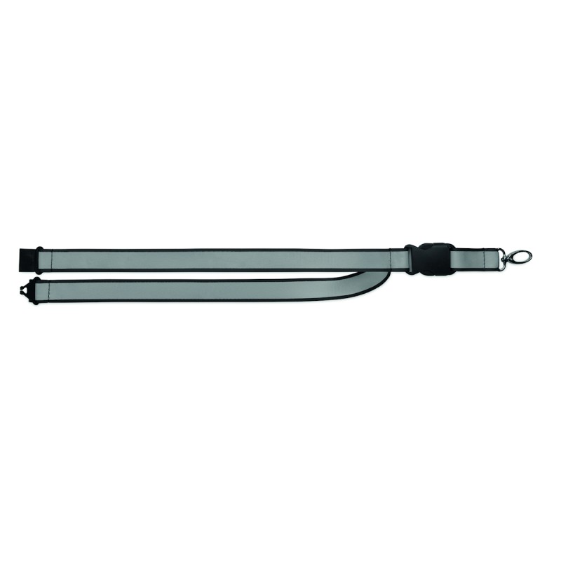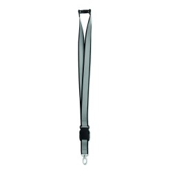 Lanyard en polyester RPET réfléchissant avec cordon de 2,5 cm, crochet métallique, boucle détachable en PP et fermeture de sécurité. Pour usage promotionnel uniquement.