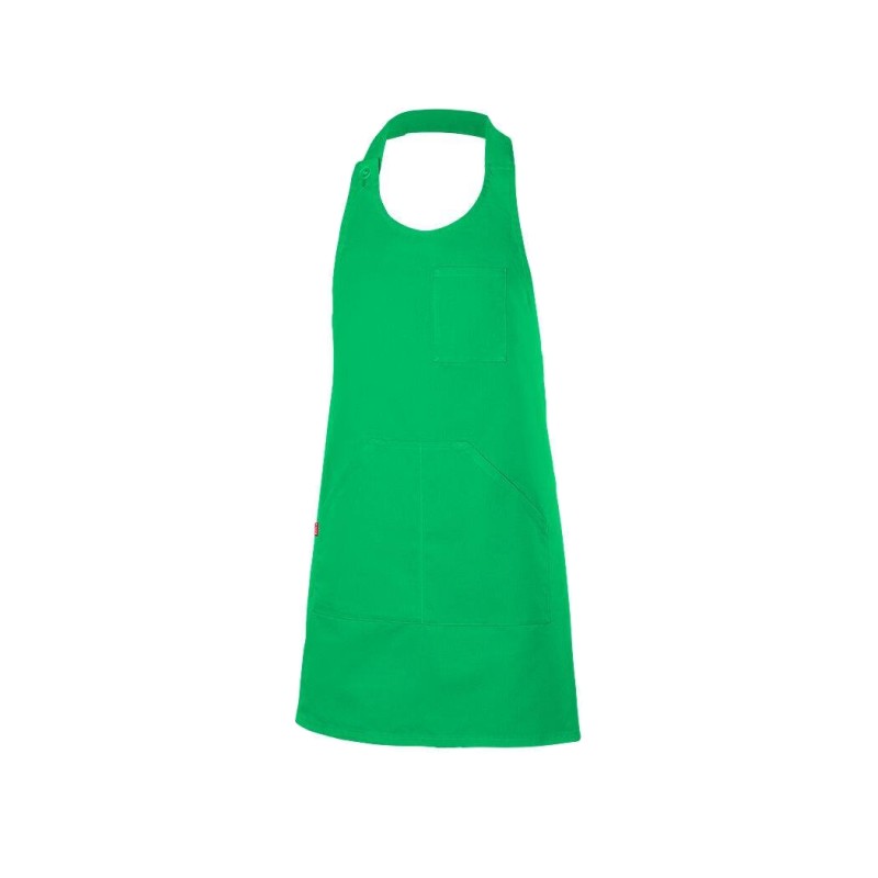 Tour de cou réglable par boutons (2 positions). Deux liens aux extrémités pour ajuster le tablier. 3 poches : 1 poche poitrine et 1 poche centrale avec 2 compartiments.
