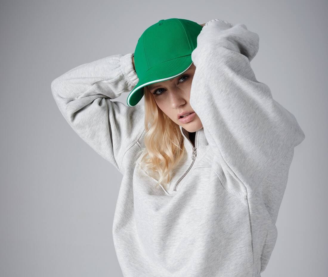 Coton brosé | Étiquette détachable pour faciliter la modification de la marque | 6 panneaux | Profile moyen | Visière précourbée | Visière sandwich de couleurs contrastées | Panneaux frontaux structurés | Trous d'aération brodés | Sangle de serrage par boucle réglable