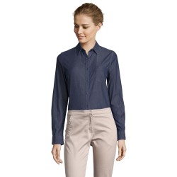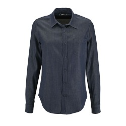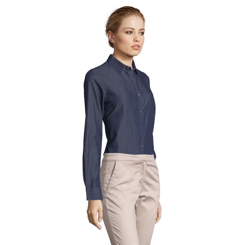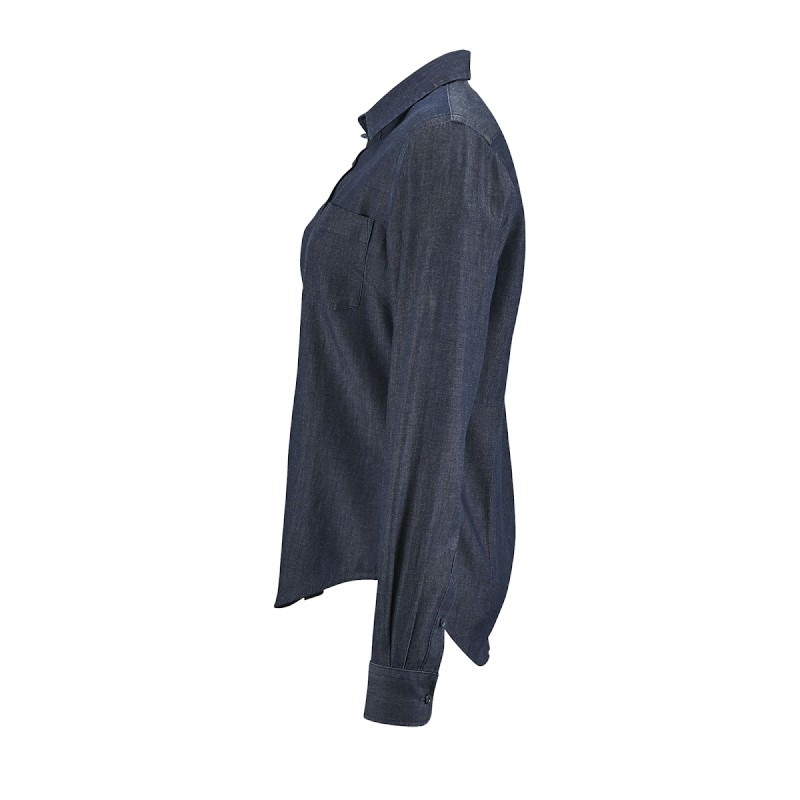 Coupe cintrée Manches longues Col classique Poignets arrondis 1 bouton Patte de boutonnage 7 boutons Patte capucin boutonnée Pinces poitrine et dos Denim Brut 1 poche poitrine Laver avec des couleurs similaires Laver avant première utilisation