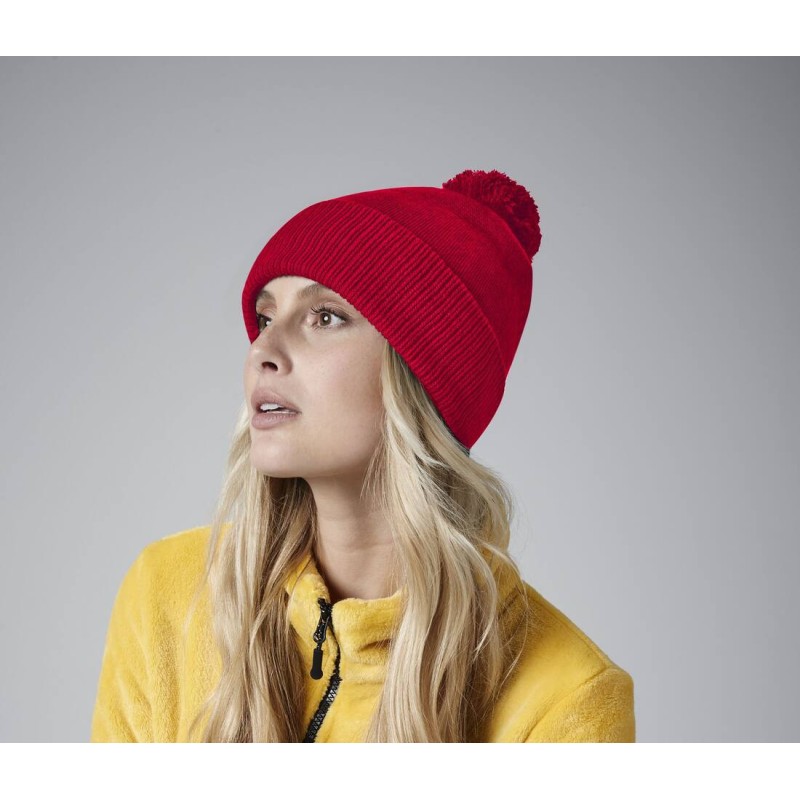 Revers à mailles. Pompon de même couleur. Double style - se porte avec ou sans revers.