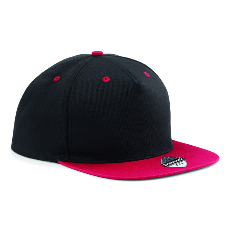 Étiquette détachable pour faciliter la modification de la marque | Visière plat | Détails contrastés | Autocollant authentique sur la visière | Fermeture en matière plastique à taille ajustable | 100% Coton Twill - 220gsm | 5 panneaux design