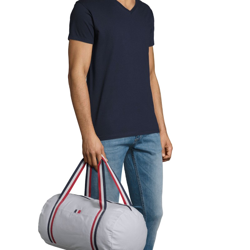Sac polochon multi-usage Anses rayées Grande ouverture avec zip contrasté 1 poche frontale avec rappel rayé 1 poche intérieure