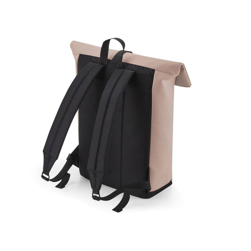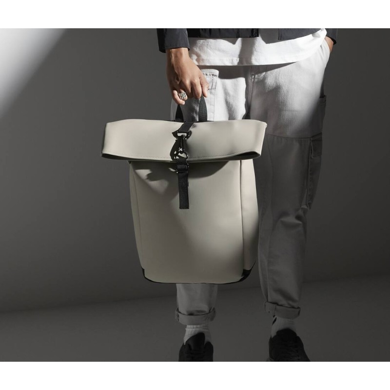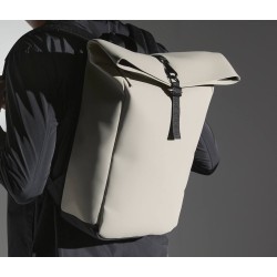 Tissu déperlant. Pochette intérieure rembourrée pour ordinateur portable (max 15,6"). Fermeture à enroulement et clip.