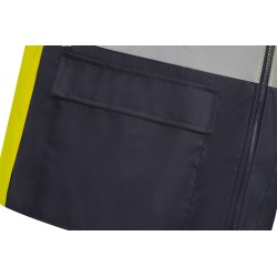 100% polyester. Fabriqué en 3 couches: 1) Extérieur: polyester enduit PU oxford. Imperméable, 2) couche intermédiaire en non-tissé et 3) doublure intérieure en molleton, afin de maximiser la résistance aux intempéries, le confort et la chaleur. L'ourlet bleu marine offre un bon contraste et aide à rester propre. Poche pour téléphone portable à la poitrine avec anneau en D en dessous. Deux poches en bas. Accès à la décoration du logo. Idéal pour le port quotidien au travail. Conforme à la norme EN ISO20471:2013 Catégorie 2.