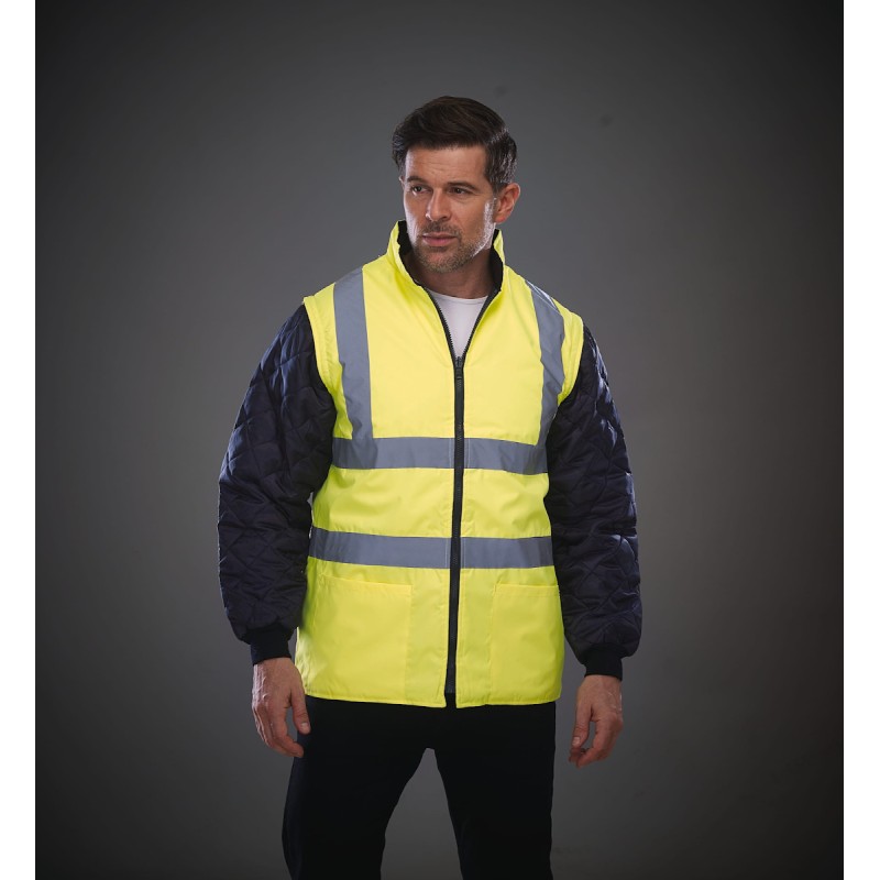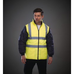 100% polyester. Deux bandes réfléchissantes de 5 cm autour du corps et sur chaque épaule. Tissu polyester enduit imperméable 300D. Rembourrage en polyester matelassé diamant de 180 g / m². Manches détachables et amovibles pour de multiples utilisations. Fermeture à glissière pleine longueur jusqu'au menton. deux poches plaquées en bas. Conforme à la norme EN ISO20471:2013 Catégorie 2.