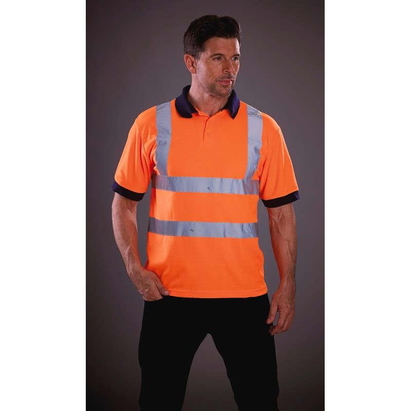 100% Polyester. Deux bandes réfléchissantes 3M de 5 cm de largeur autour du corps et une sur chaque épaule. Col et poignets en maille marine contrastés. Patte à 3 boutons. Finition double aiguille. EN ISO20471: 2013 classe 2. Hi Vis Orange est également conforme à la norme UK des chemins de fer GO / RT 3279.
