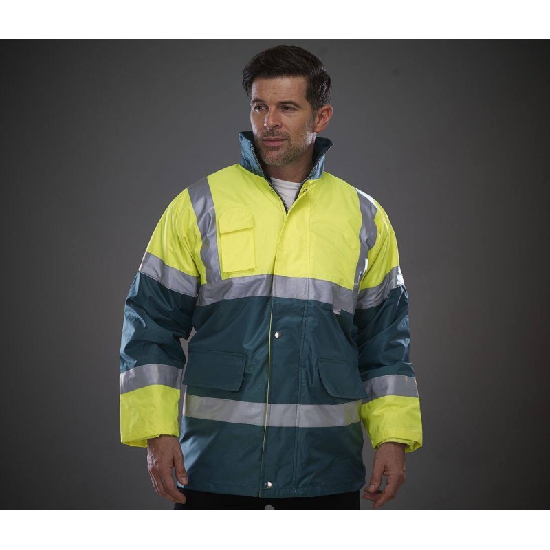 100% polyester. Veste imperméable coupe-vent aux couleurs contrastées offrant une visibilité accrue pour la sécurité. Idéal pour le personnel de terrain de football, les organisateurs d’événements, les gardiens de parking, les agents de sécurité incendie et le personnel paramédical, etc. Tissu extérieur en polyester Oxford revêtu de PU avec rembourrage matelassé. Poche pour téléphone portable et Talkie Walkie. Deux poches avant et une poche de sécurité intérieure. Conforme à la norme EN ISO20471:2013 Catégorie 1 et EN343: Class 3.1 de protection contre les intempéries.