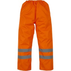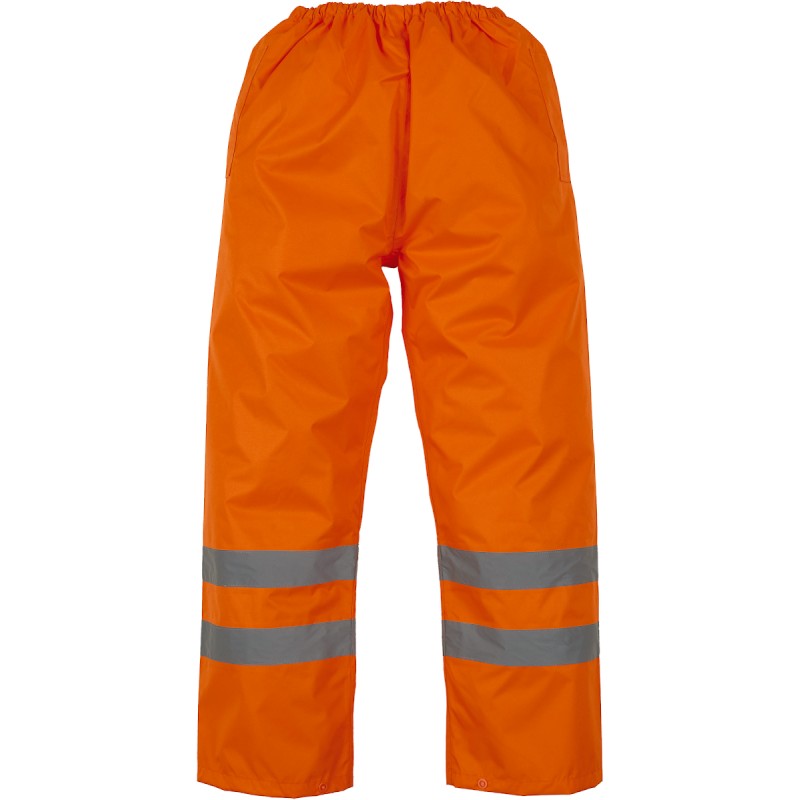 100% polyester. Revêtement Oxford PU. Imperméable. Deux bandes réfléchissantes de 5 cm de large au bas des jambes. Ceinture élastiquée. Boutons pressions au bas pour le réglage. Coutures cousues et collées. Conforme aux normes EN ISO20471:2013 catégorie 1 et EN343 relative à la protection contre le mauvais temps : uniquement Hi Vis Yellow, Hi Vis Yellow/Navy, Hi Vis Orange et Hi Vis Orange/Navy. Egalement conforme à la norme relative aux 'Vêtements de Haute Visibilité' des chemins de fer UK GO/RT 3279 Issue 8:2013 (Hi Vis orange et Hi Vis orange/navy).