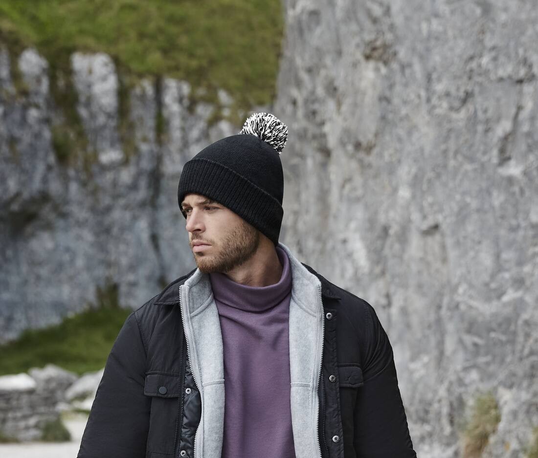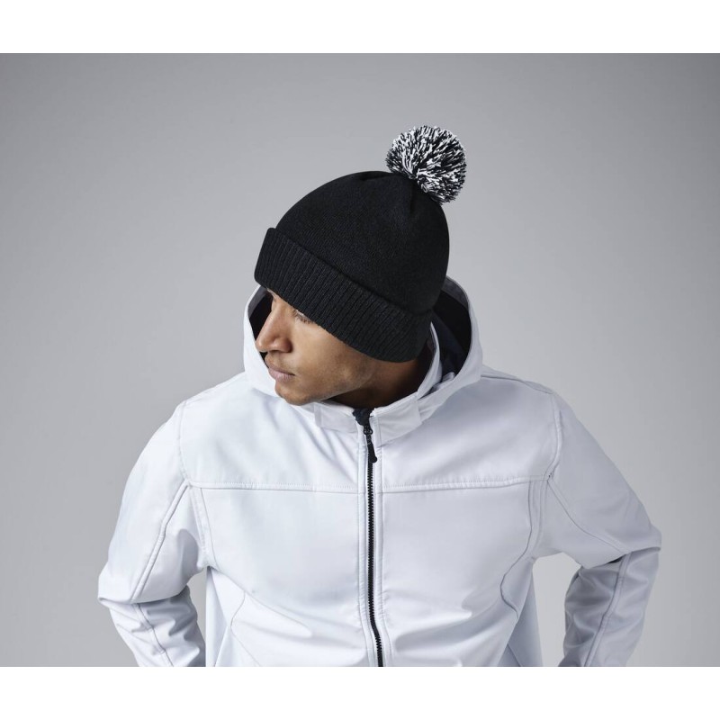 Doublé. Pompon bicolore. Double style - se porte avec ou sans revers.