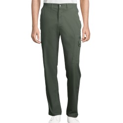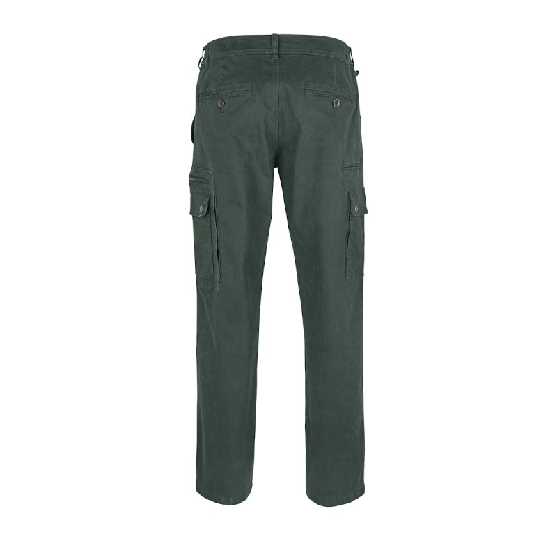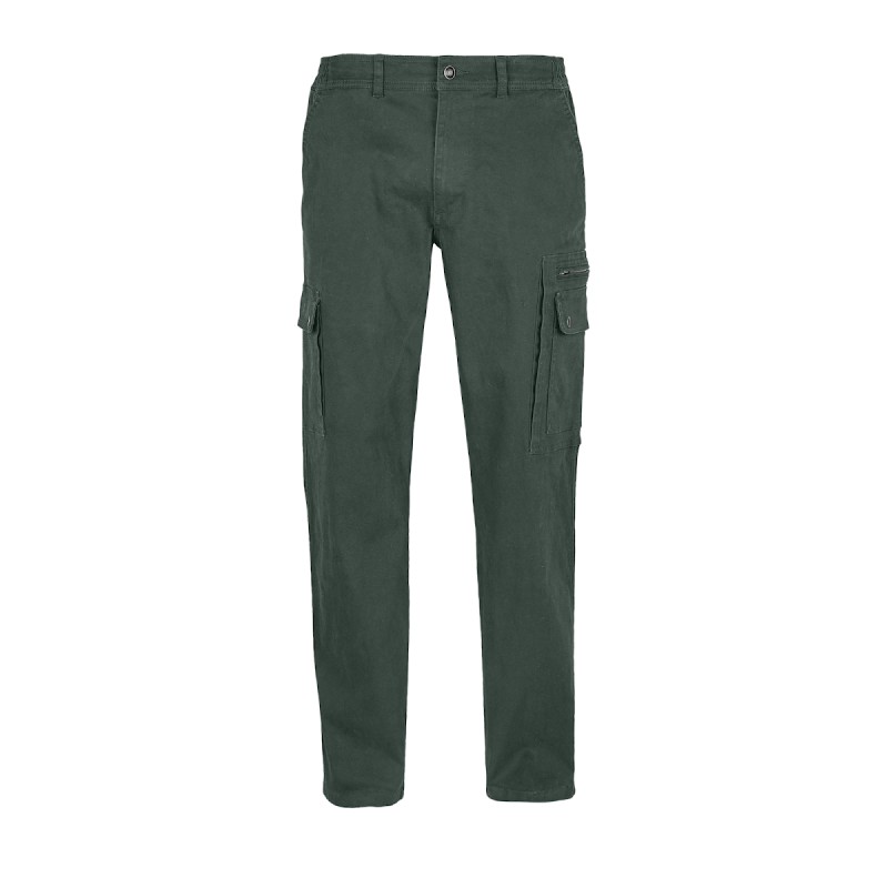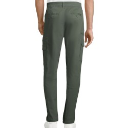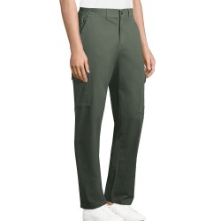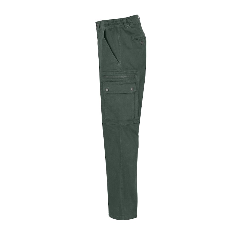 Fermeture éclair et bouton en métal Taille élastiquée avec passants renforcés 2 poches côté italiennes 1 poche plaquée avec fermeture éclair sur la jambe gauche 2 poches plaquées latérales à rabat et boutons-pression 2 poches arrière passepoilées avec boutonnière 1 poche ticket Coupe moderne