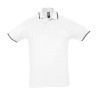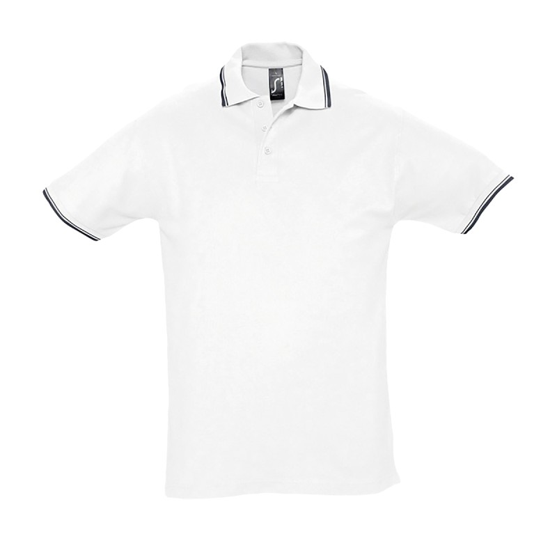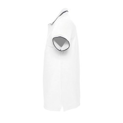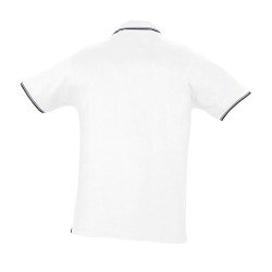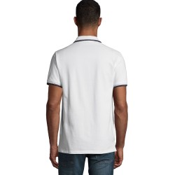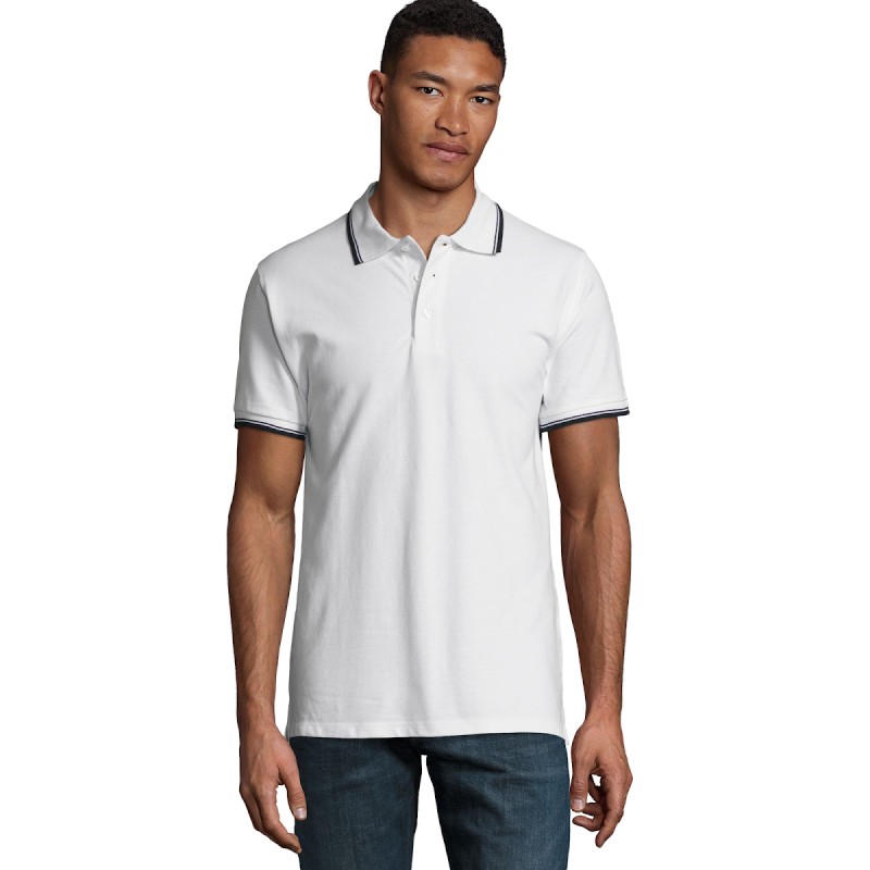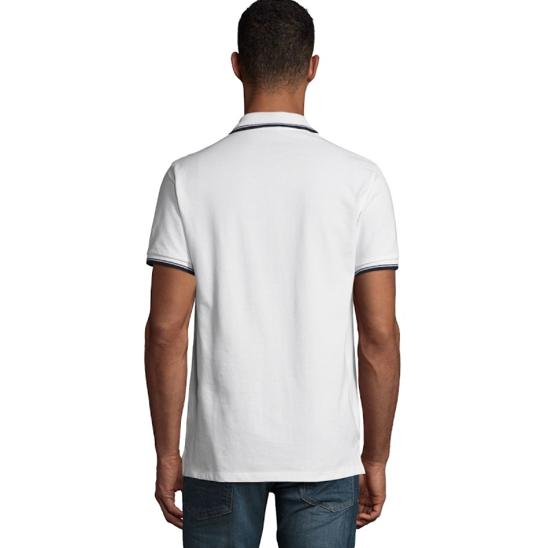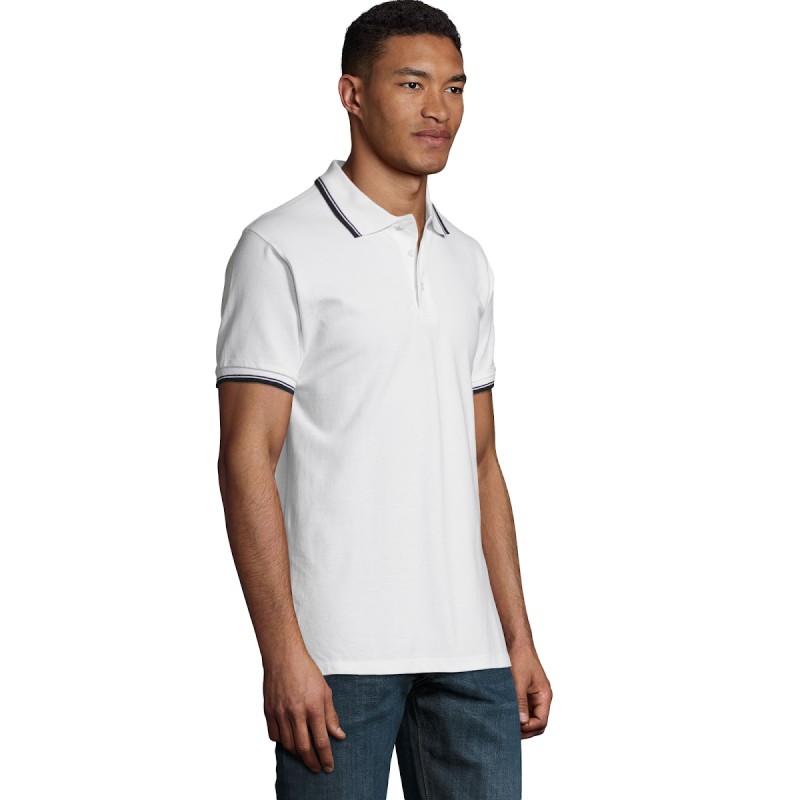 Col et bas de manches en côte Bande de propreté au col Manches courtes Col et bas de manches rayés contrastés Patte 3 boutons ton sur ton Bas droit avec fentes latérales contrastées en twill Coupé cousu Bouton de rechange sur couture intérieure côté