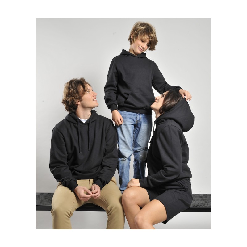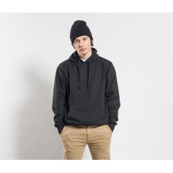Poche kangourou. Coupe tubulaire. Capuche doublée. Intérieur gratté.