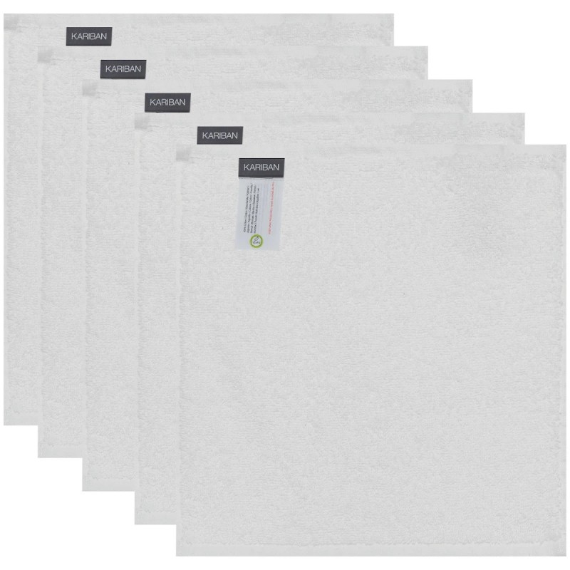 100% coton. Maille bouclette. Lot de 5 serviettes. Dimensions : 30 x 30 cm. Etiquettes de marque détachables.