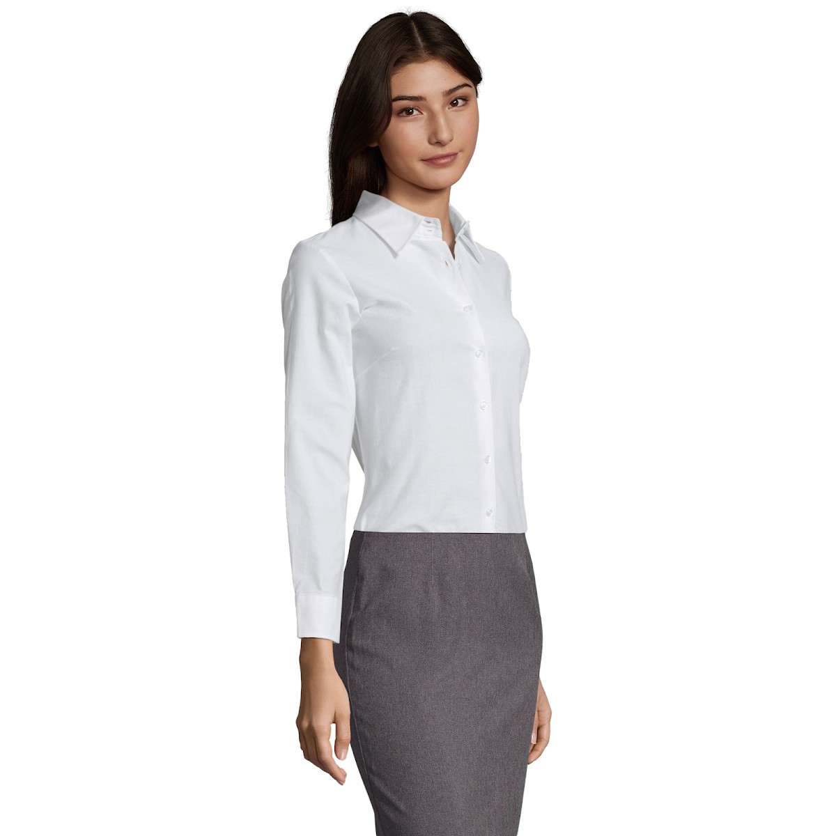 Coupe cintrée Manches longues Col classique Poignets ajustables arrondis Patte 7 boutons ton sur ton Pinces poitrine