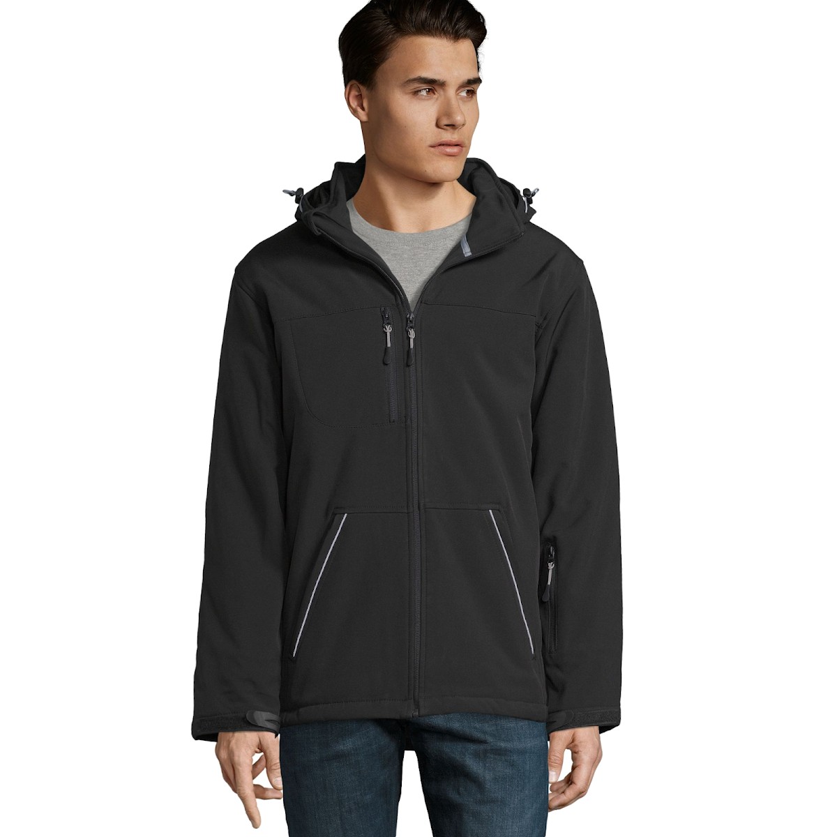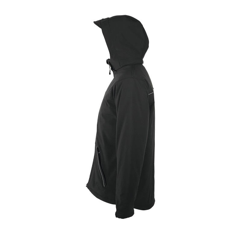 Softshell hiver entièrement matelassée Capuche, avec visière, détachable et ajustable avec lien de resserrage et stoppeurs + bande auto-agrippante ajustable 3 poches zippées devant + 1 poche zippée manche + 1 poche zippée intérieure + 1 poche intérieure en filet Poignets ajustables avec bande auto-agrippante avec poignets resserrés stretch à l'intérieur Cordons de resserrage bas de vêtement