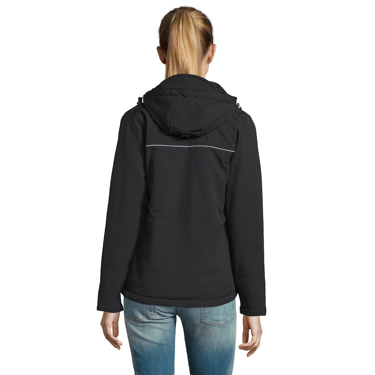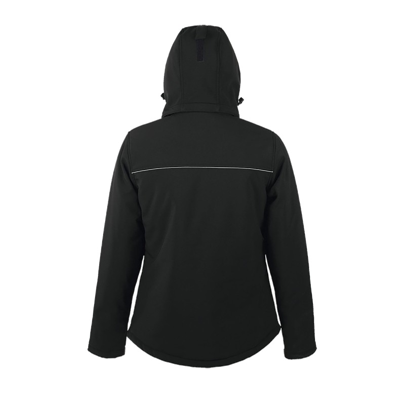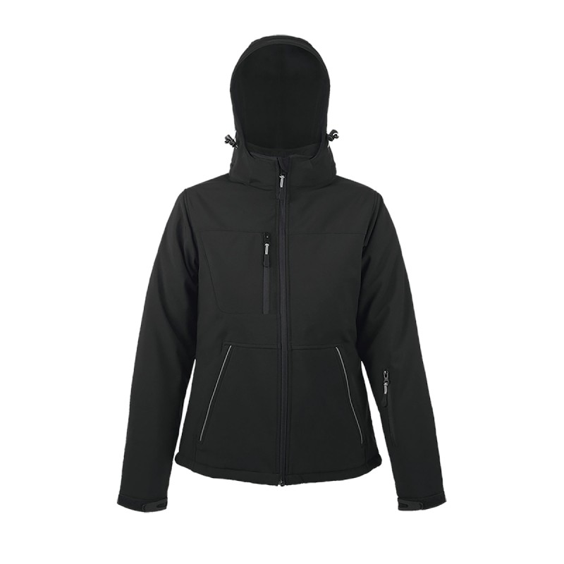 Softshell hiver entièrement matelassée Capuche, avec visière, détachable et ajustable avec lien de resserage et stoppeurs + bande auto-agrippante ajustable 3 poches zippées devant + 1 poche zippée manche + 1 poche zippée intérieure + 1 poche intérieure en filet Poignets ajustables par bande auto-agrippante avec poignets resserrés stretch à l'intérieur Cordons de resserrage bas de vêtement Coupe ajustée et féminine