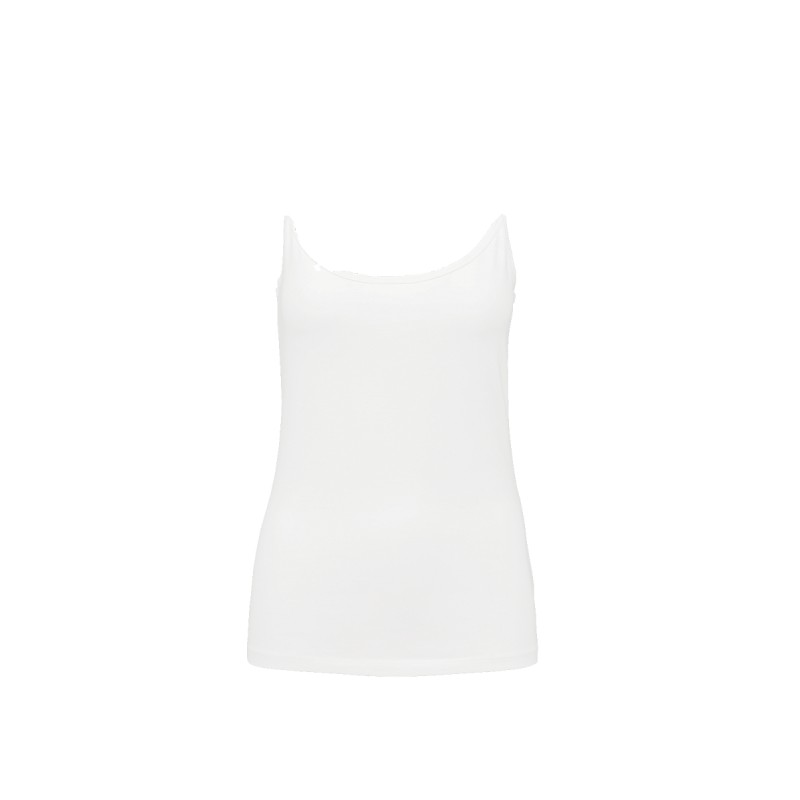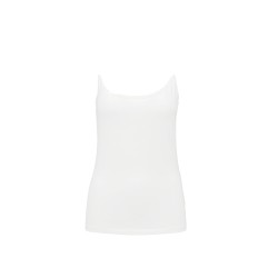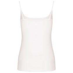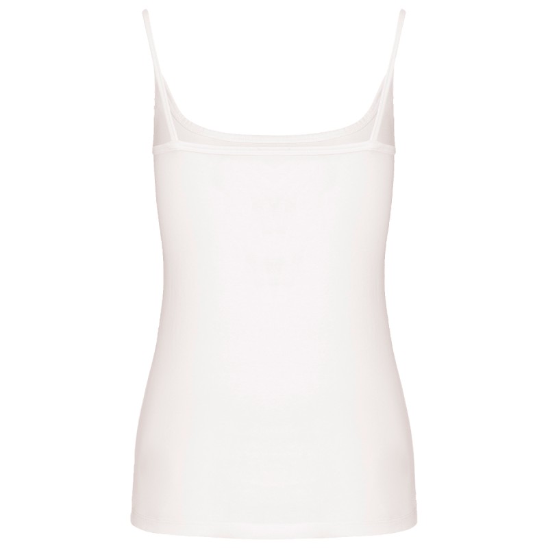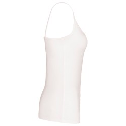 95% coton / 5% élasthanne. (Light Grey Heather : 87% coton / 9% viscose/ 4% élasthanne). Maille jersey en coton peigné. Fines bretelles et coupe féminine. Finition petit biais encolure et double aiguille au bas du vêtement.