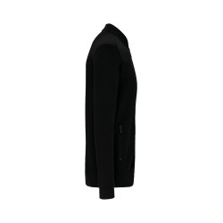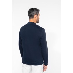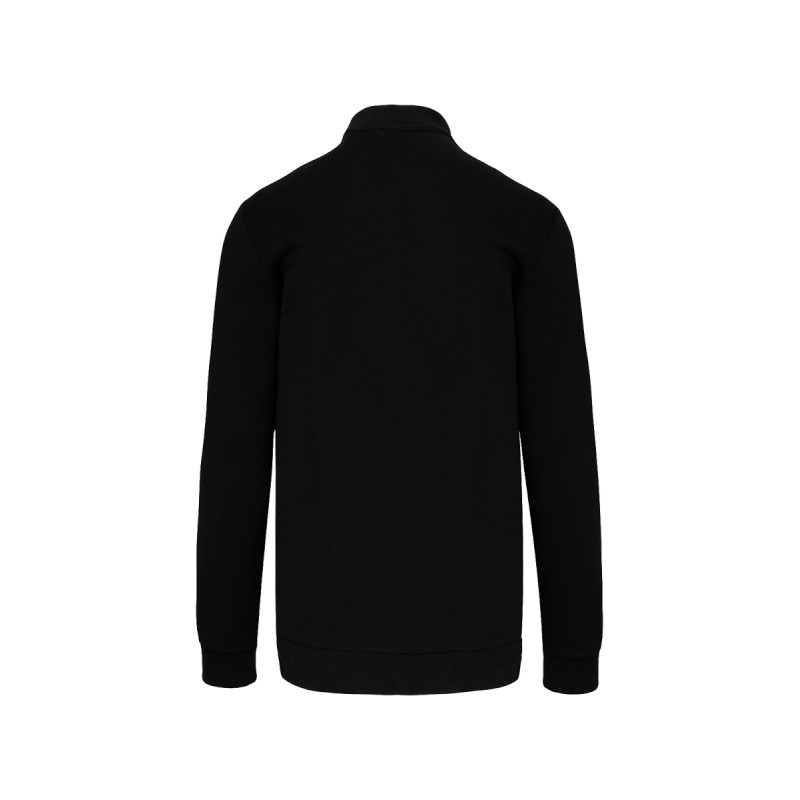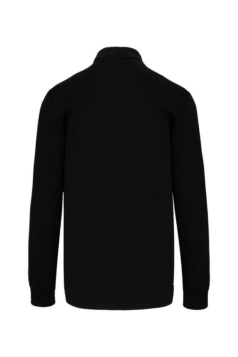 80% coton / 20% polyester. Molleton 3 fils avec traitement LSF (Low Shrinkage Fleece). Lavable à 60°C. Fermeture zippée et 2 poches zippées devant ton sur ton. Col Teddy. Bande de propreté chevron dans le col. Bord-côte bas de manches et bas de vêtement.