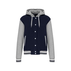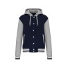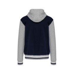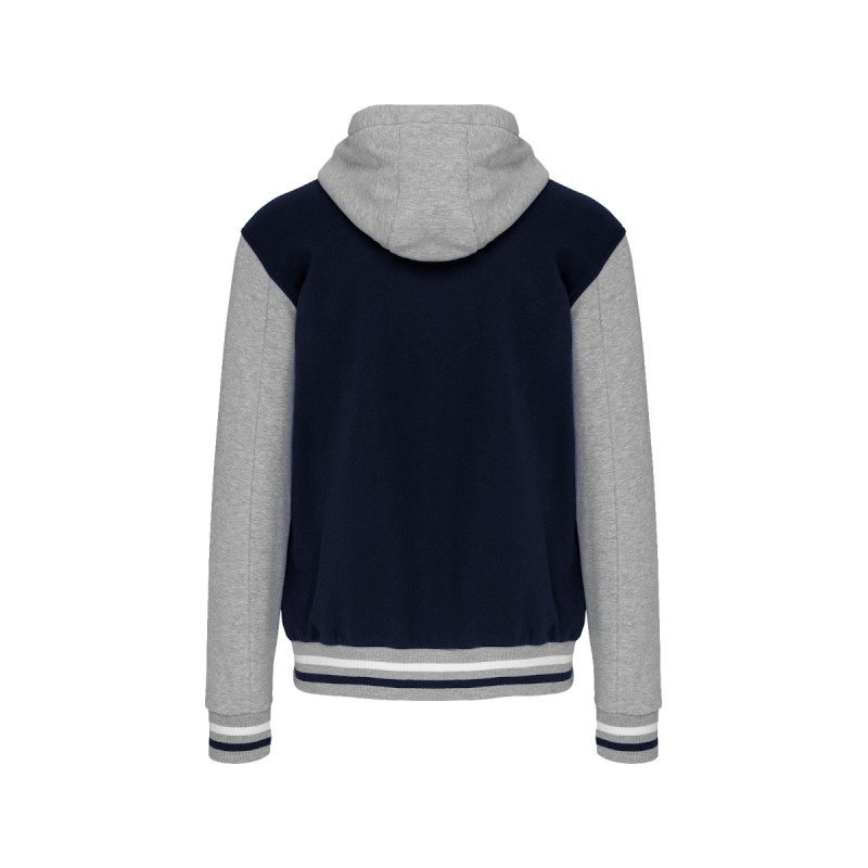 70% coton / 30% polyester. Molleton gratté 3 fils. Manches montées contrastées. Capuche en 3 parties, doublure jersey et cordons contrastés. Fermeture devant par boutons pression. Bord côte avec 2 liserés contrastés au col, manches et bas de vêtement. 2 poches passepoilées devant. Bande de propreté en chevron et boucle d'accrochage à l'intérieur col. Pas d'étiquette de marque au col, uniquement une puce de taille pour faciliter la personnalisation.