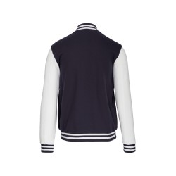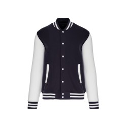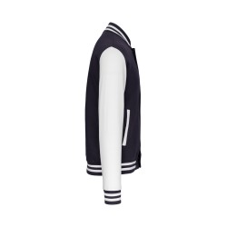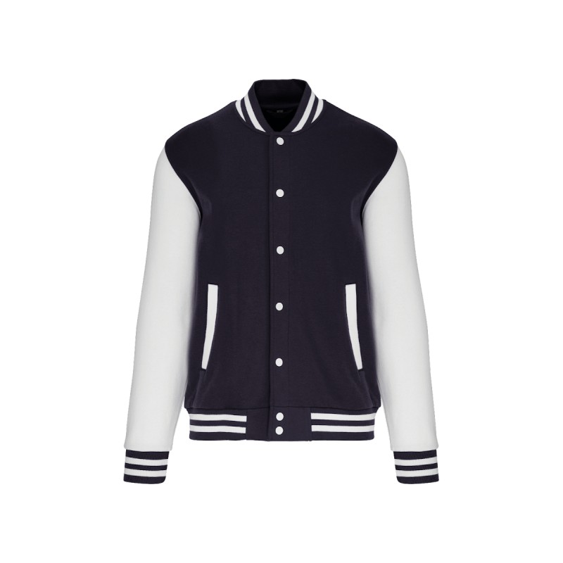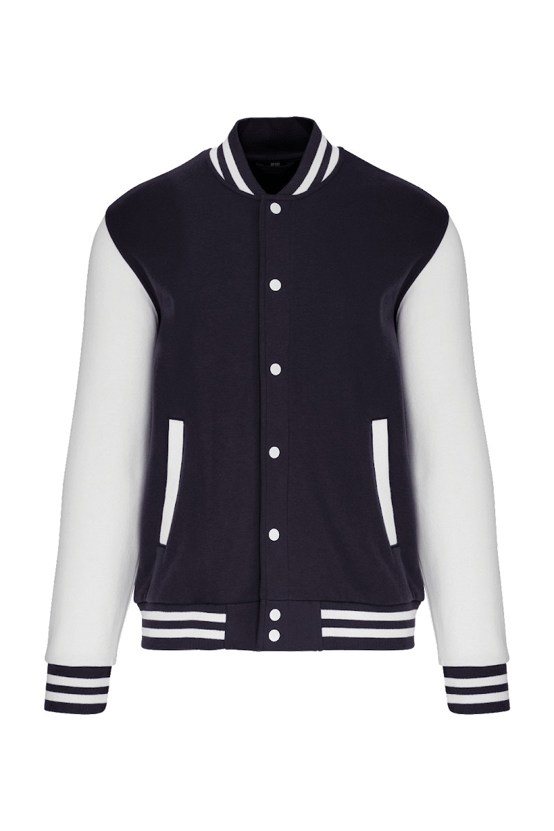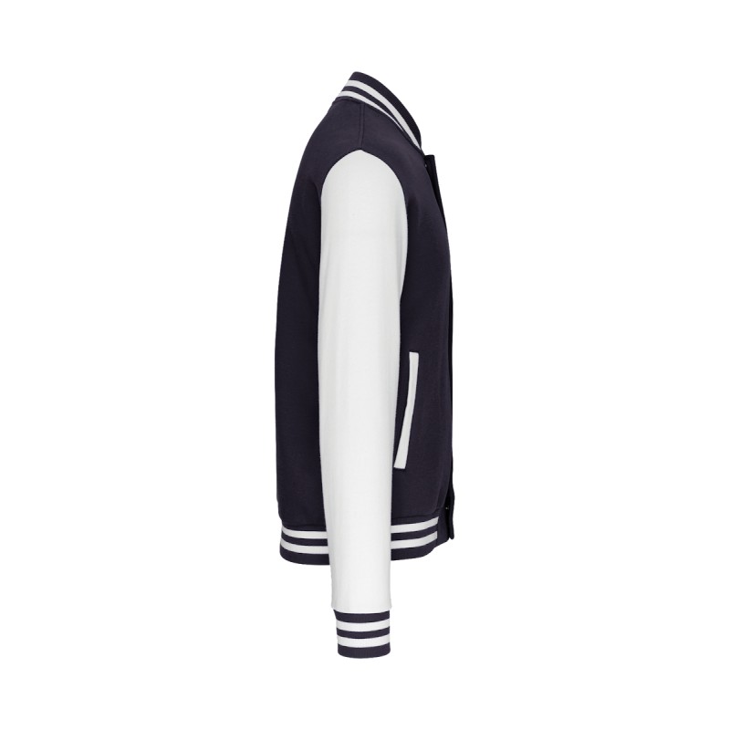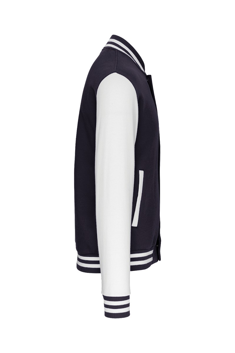 70% coton / 30% polyester. Molleton gratté 3 fils. Manches montées contrastées. Fermeture devant par boutons pression. Bord-côte avec 2 liserés contrastés au col, manches et bas de vêtement. 2 poches passepoilées devant. Bande de propreté en chevron et boucle d'accrochage à l'intérieur col. Pas d'étiquette de marque au col, uniquement une puce de taille pour faciliter la personnalisation. Véritable icône de la mode, il se décline partout, de la rue aux bancs des écoles et même sur les podiums.