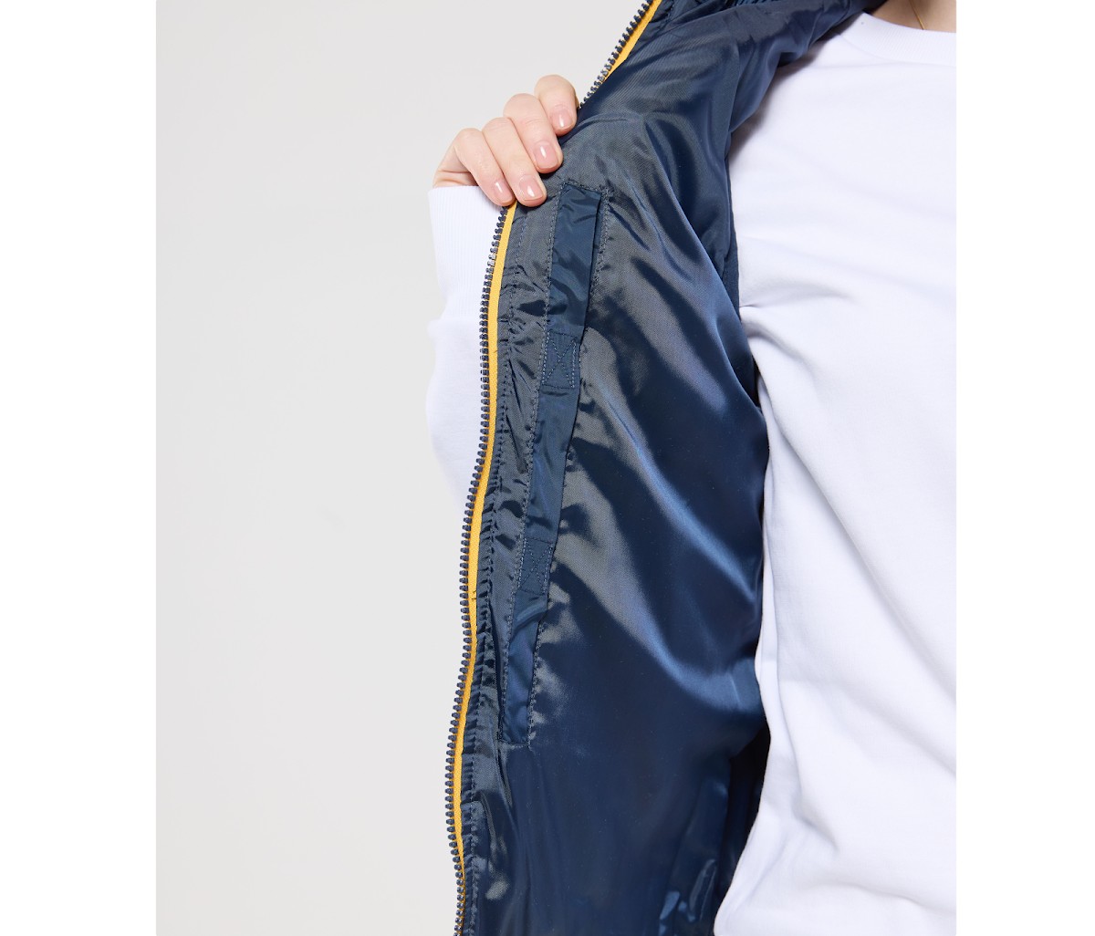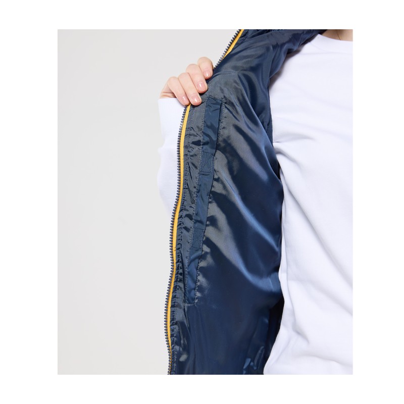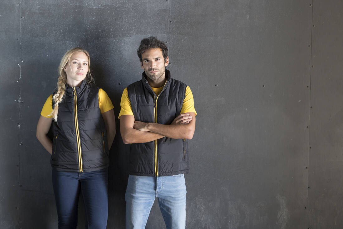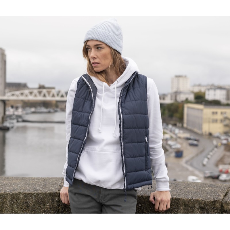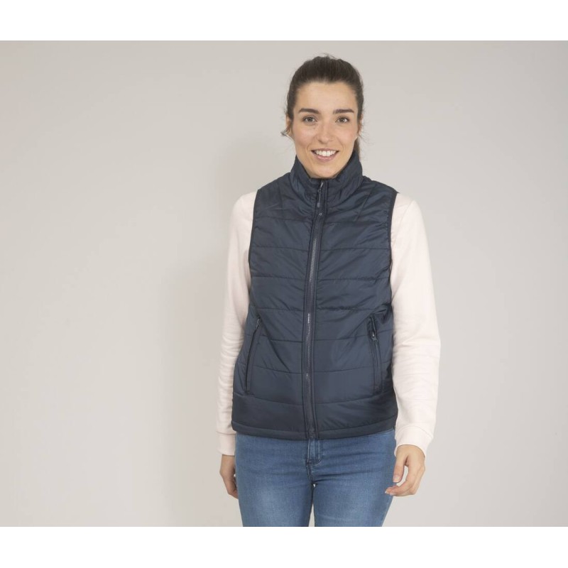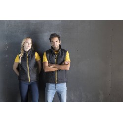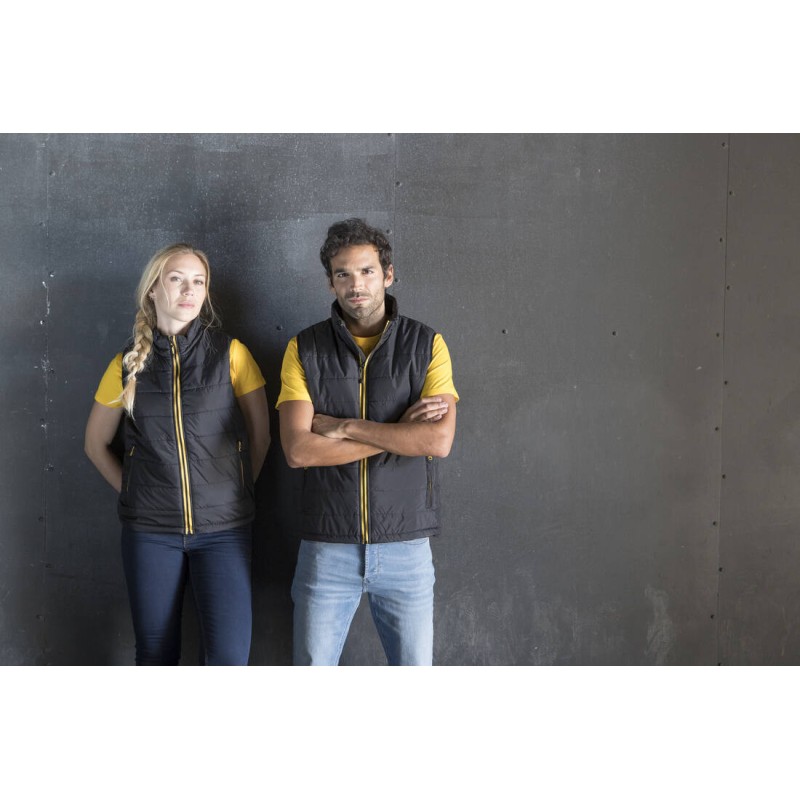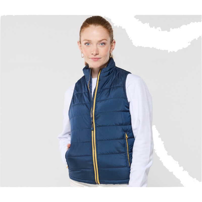 Grand zip avec une poche intérieure gauche pour marquage. Possibilité de ranger totalement le bodywarmer dans la poche intérieure droite avec fermeture Velcro®. 2 poches latérales zippées avec rabat.