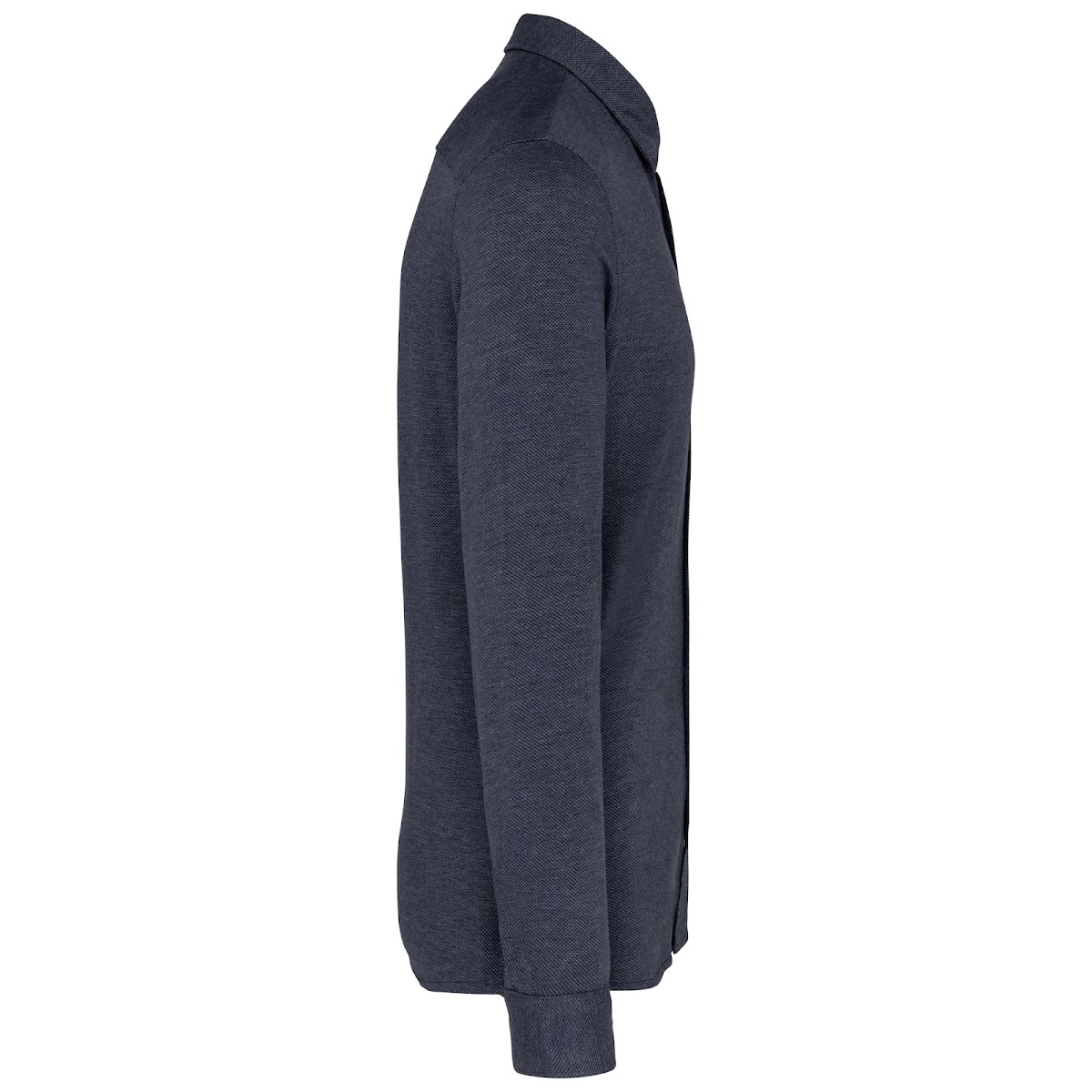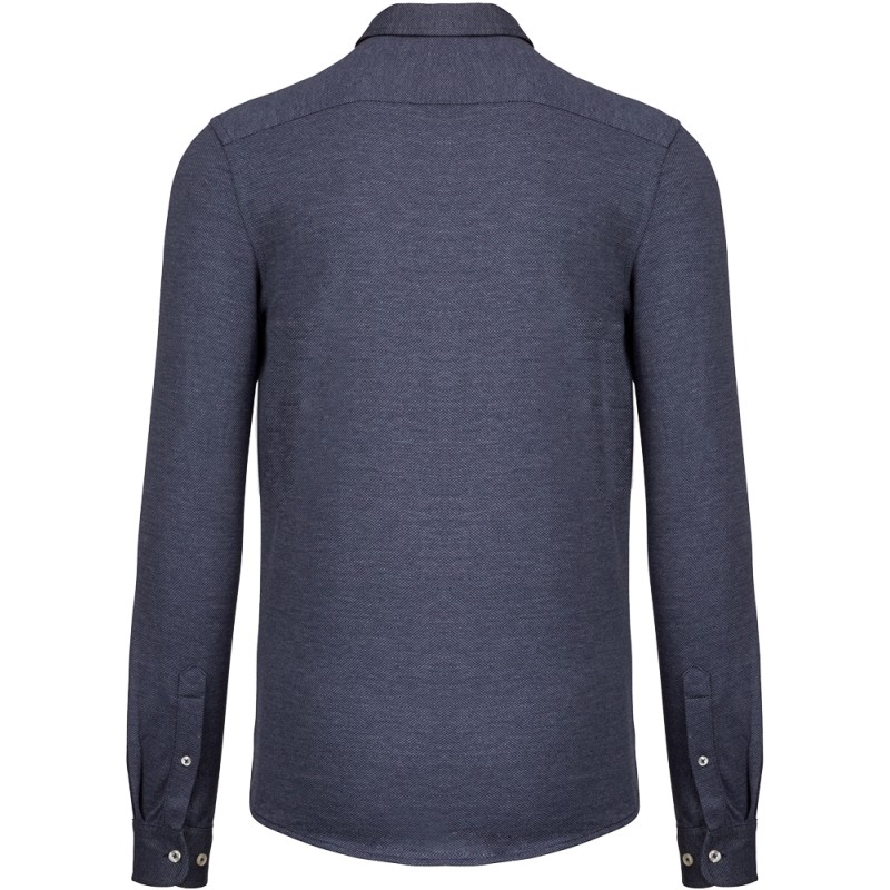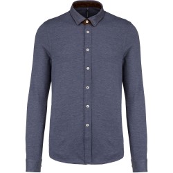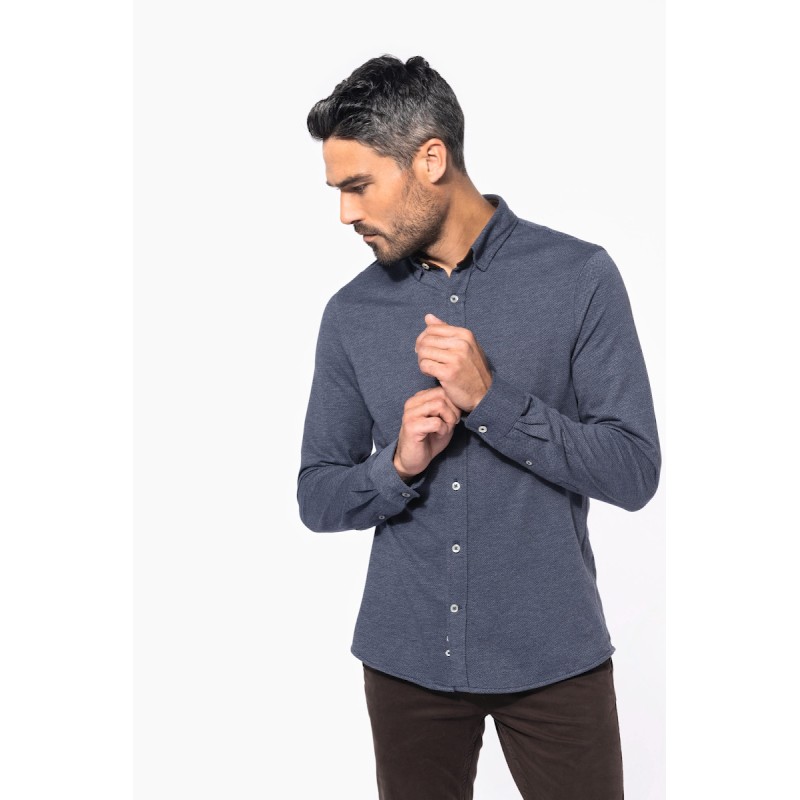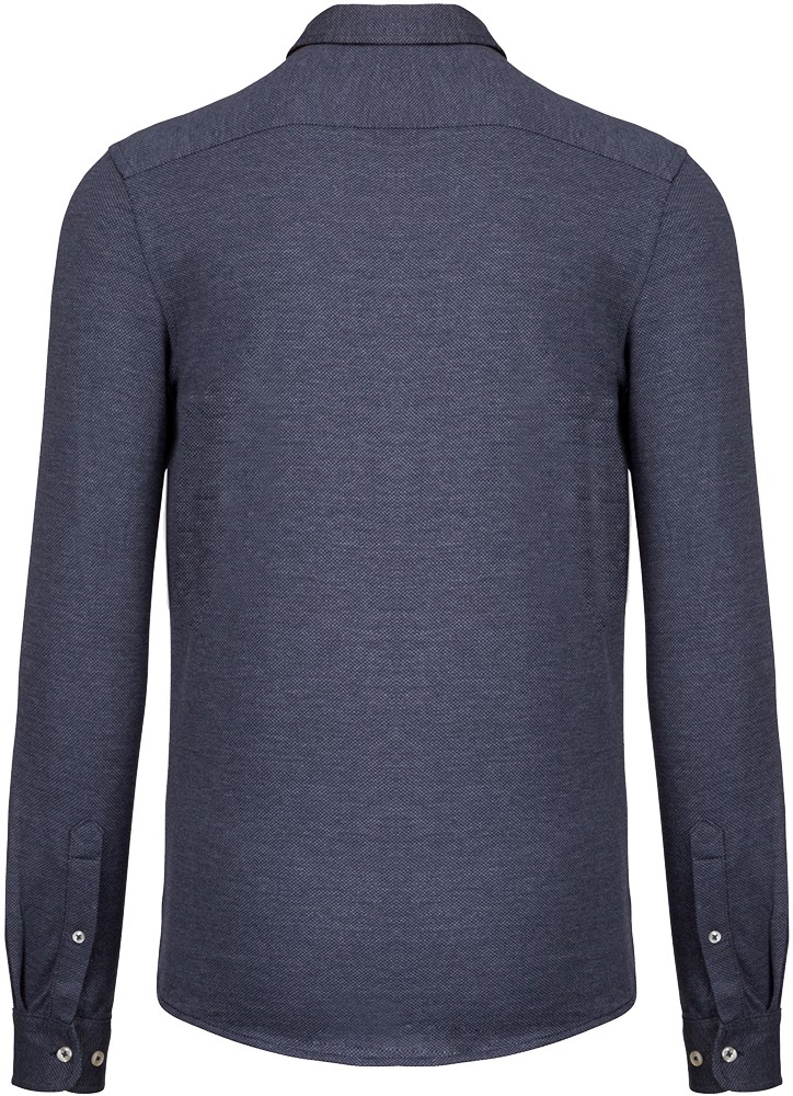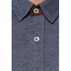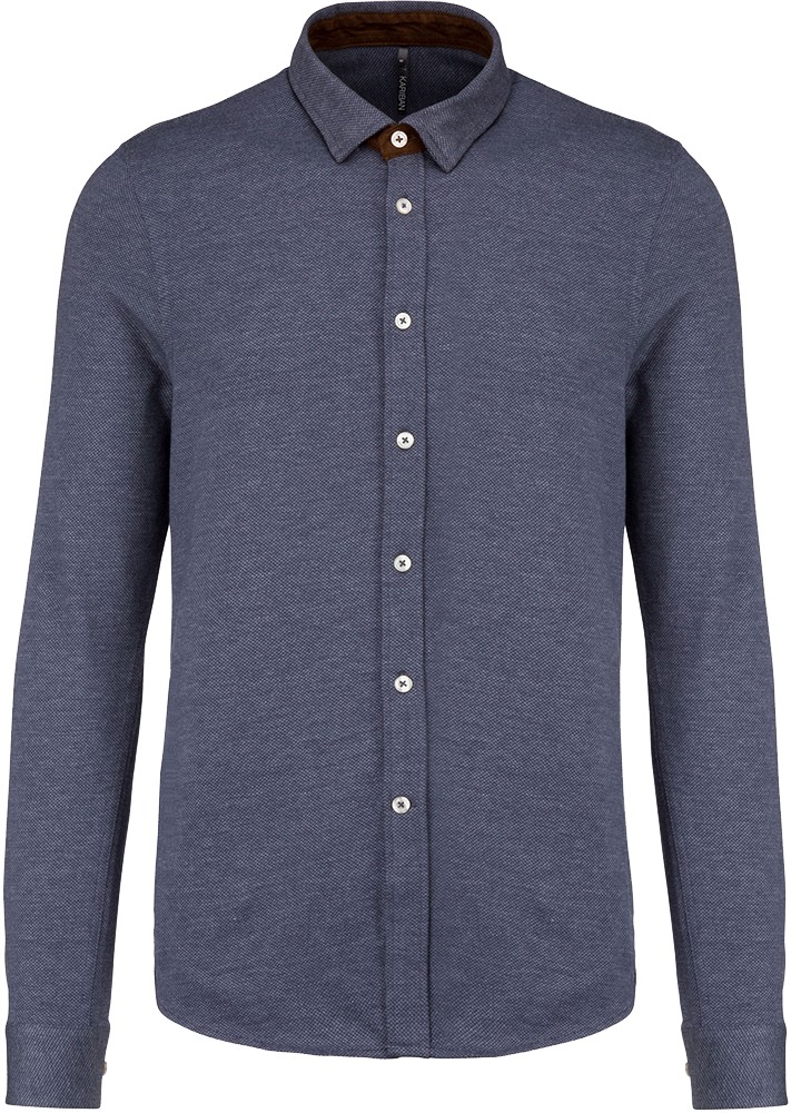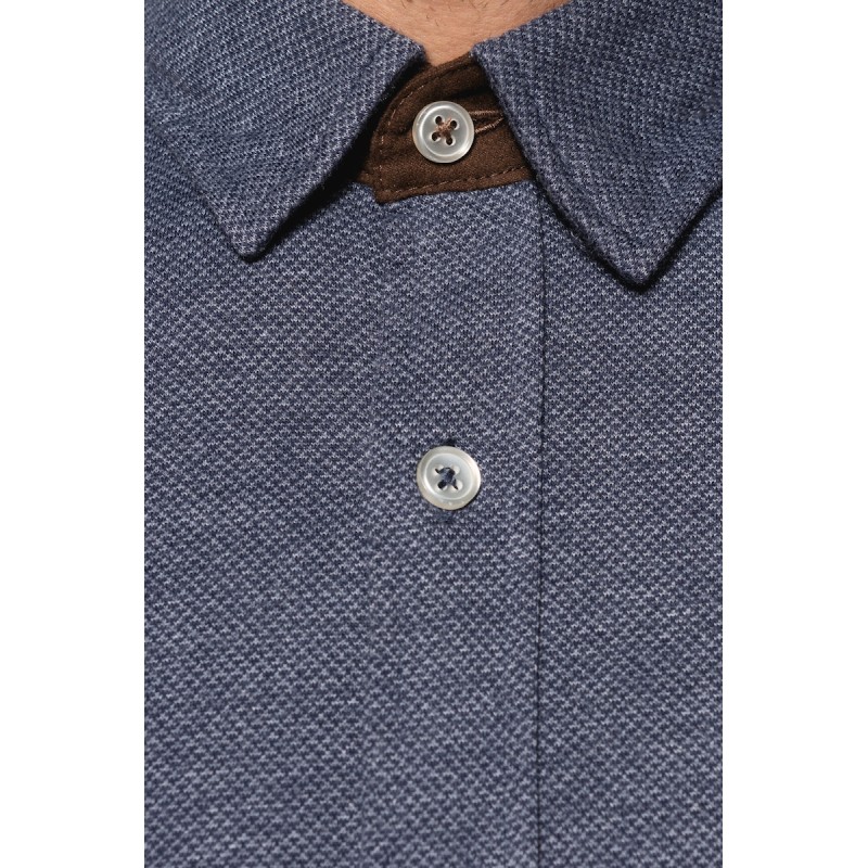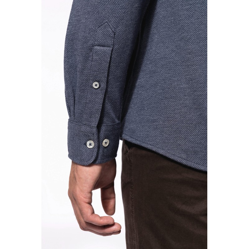 68% coton / 32% polyester. Maille jacquard. Pied de col en suédine contrasté. Look moderne. Matière confortable et douce. Patte de boutonnage classique avec boutons imitation nacre. Poignets réglables avec boutons imitation nacre. Bas arrondi.