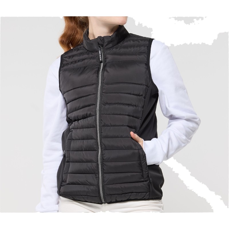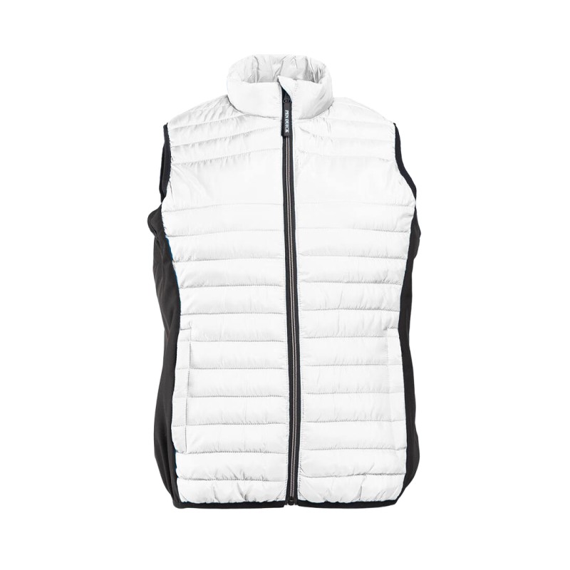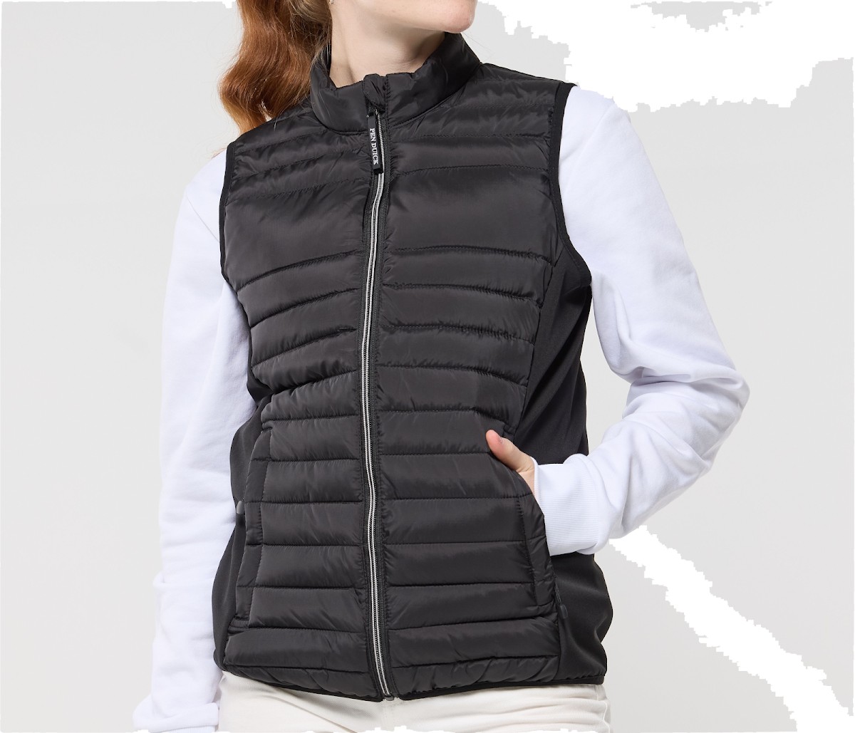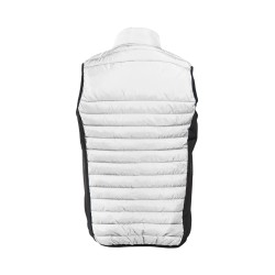 Bodywarmer léger moderne bi-matière. 2 poches latérales zippées. Zips contrastés.