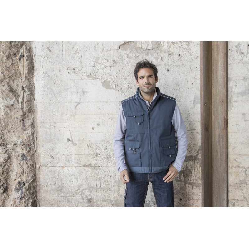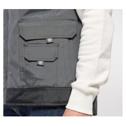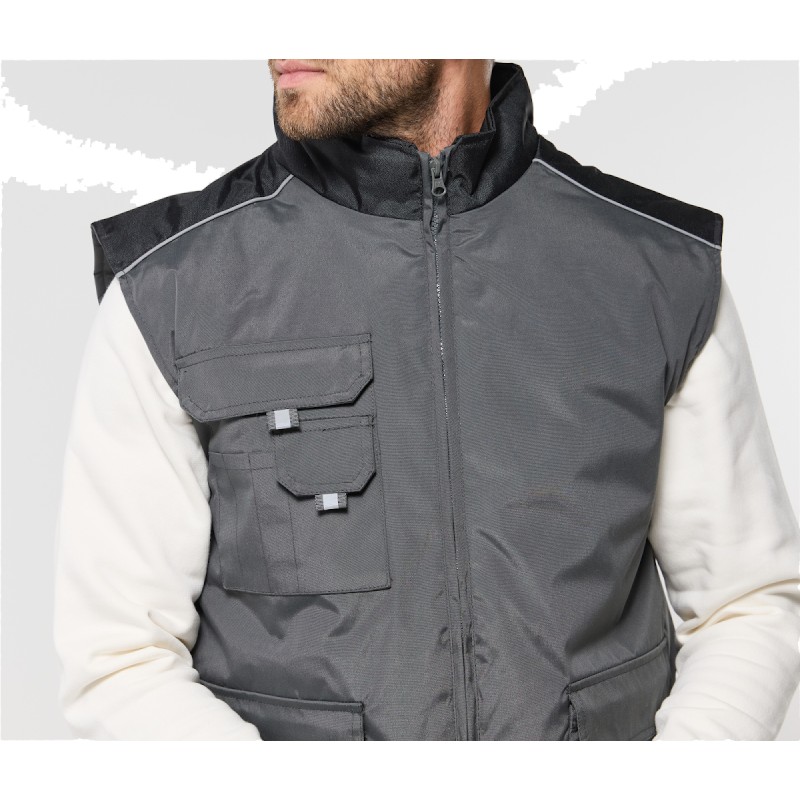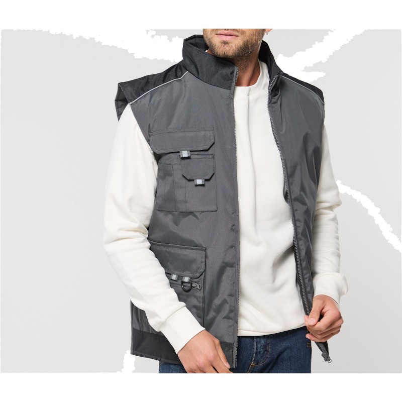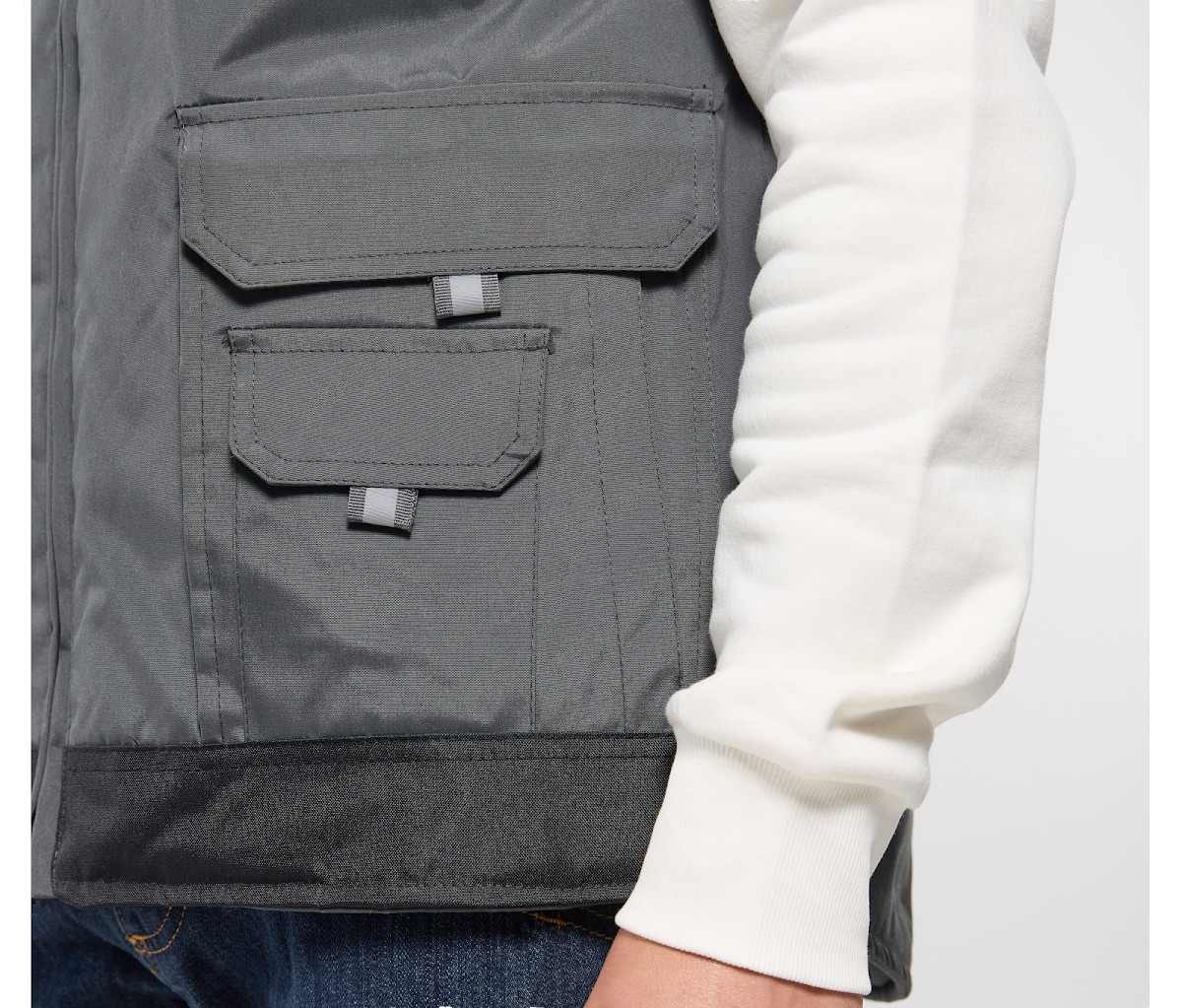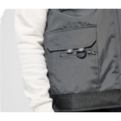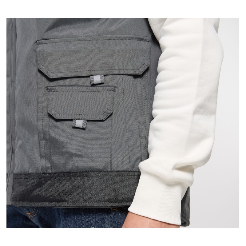 Empiècement épaules, col et partie basse avant en Oxford 330D. 11 poches extérieures. Bandes réfléchissantes épaules et poches.