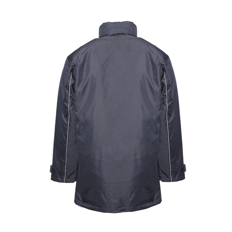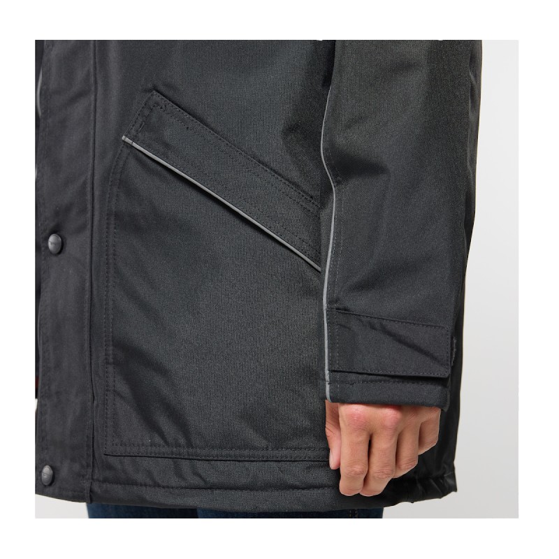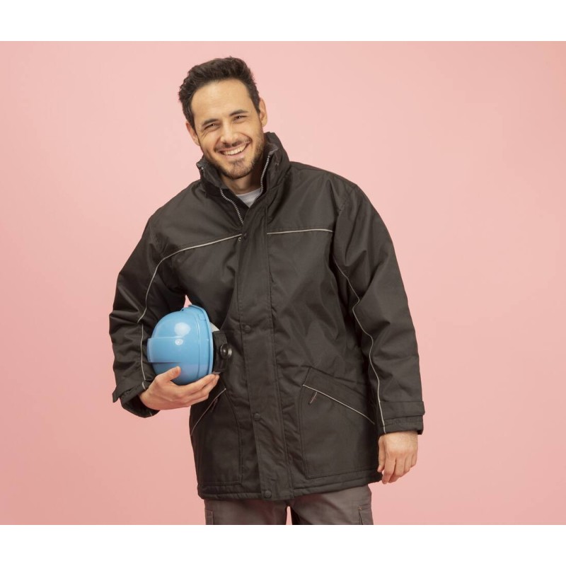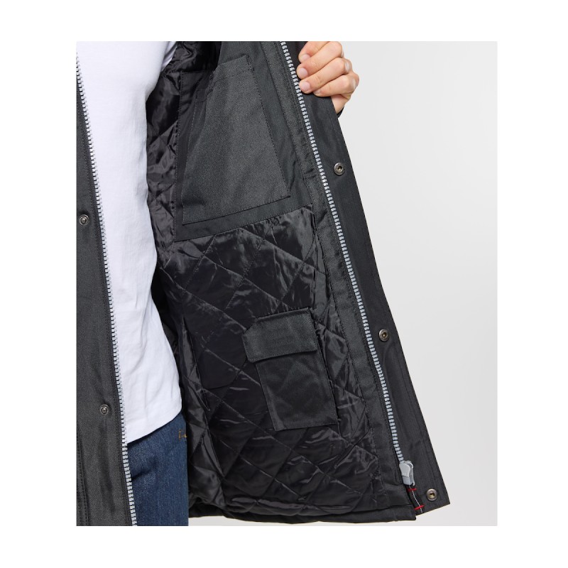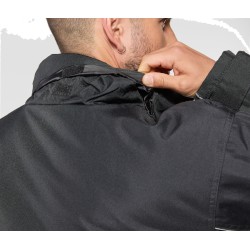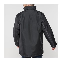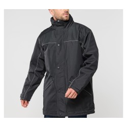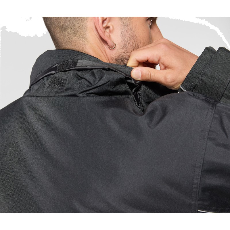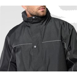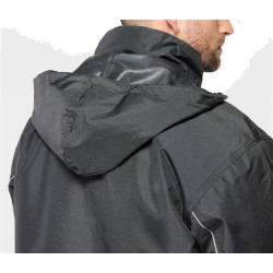 Coupe-vent avec enduction imperméable. 2 poches extérieures zippées. Capuche en Oxford dans le col.