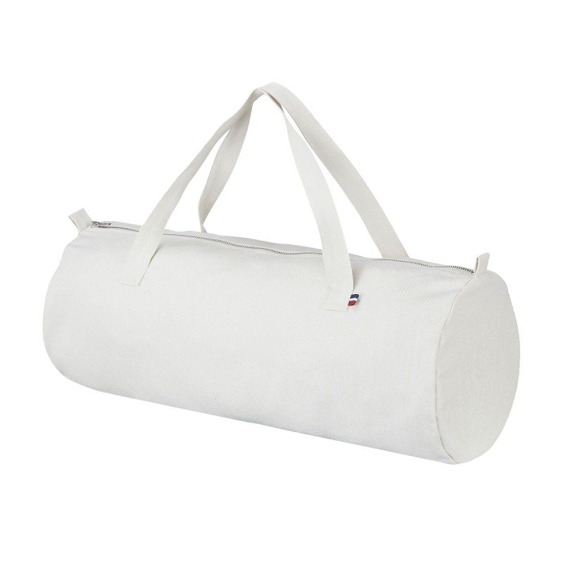 Sac polochon pratique avec sa fermeture zippée en métal Anses plaquées double épaisseur avec renfort coutures autour du sac Dimensions anses : 44 x 2,5 cm Anses espacées de 24,5 cm pour faciliter la personnalisation Galon tricolore fixé dans la anse