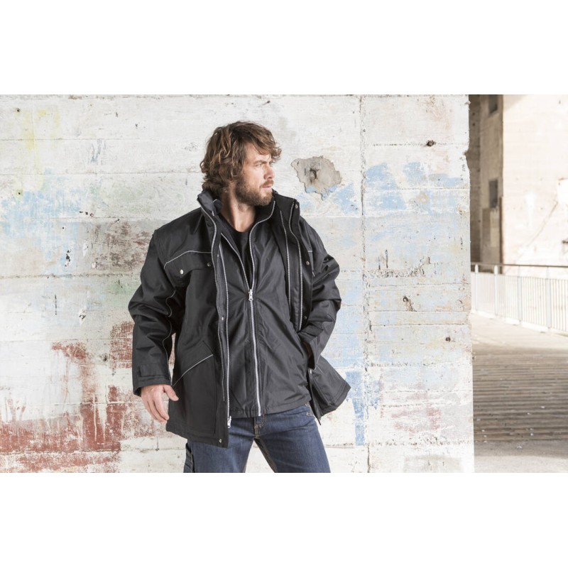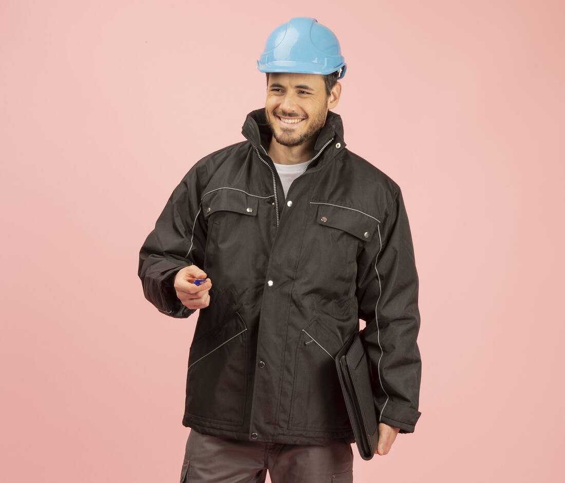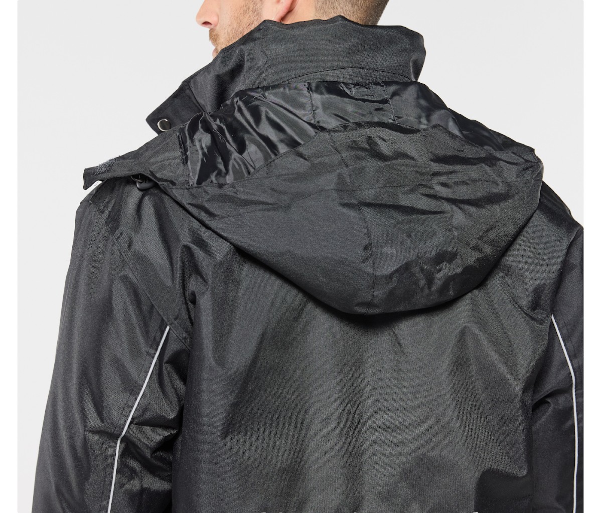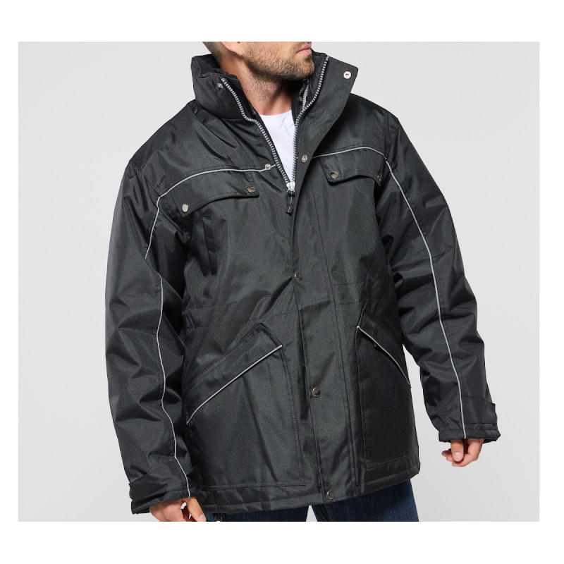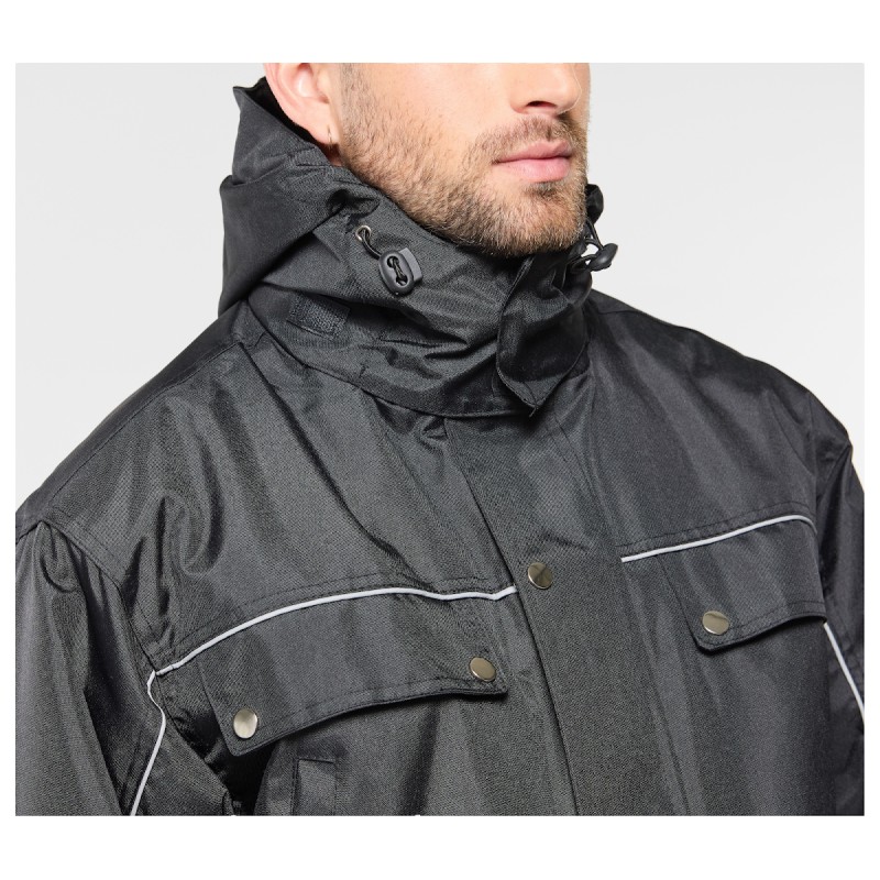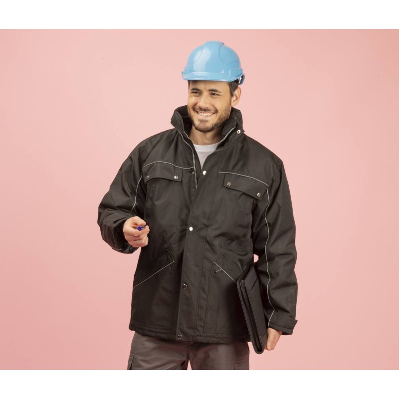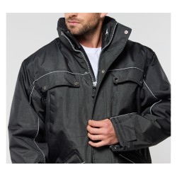 Veste de travail 3 en 1. Coupe-vent et imperméable. Passepoil réfléchissant sur le devant et le dos des manches. Capuche passe-montagne dans le col.