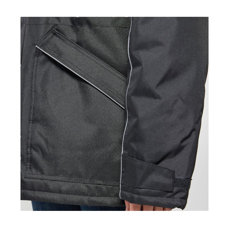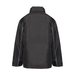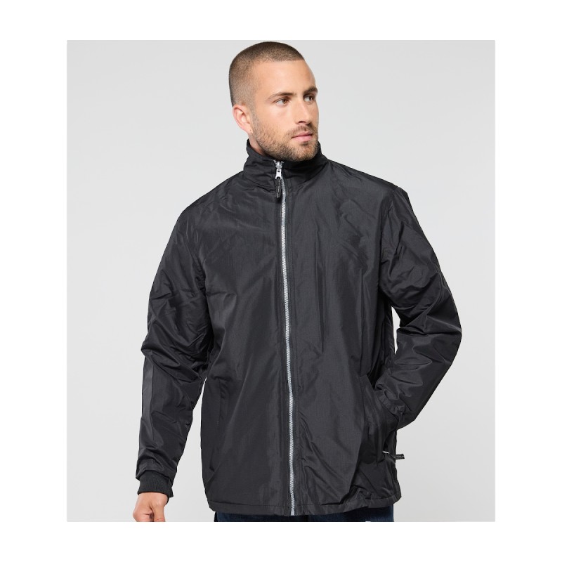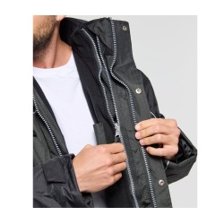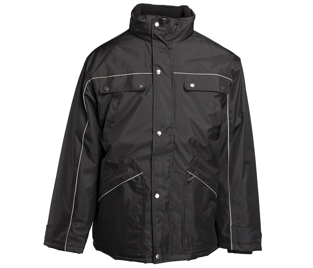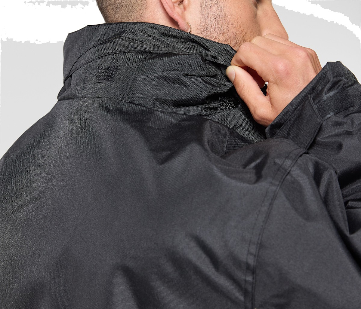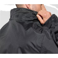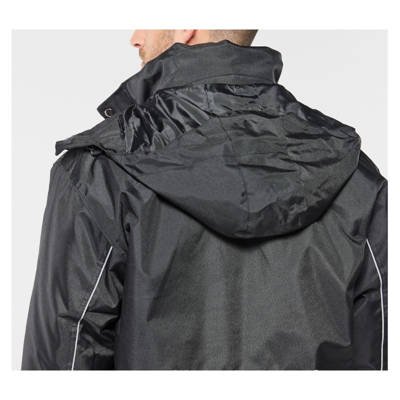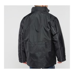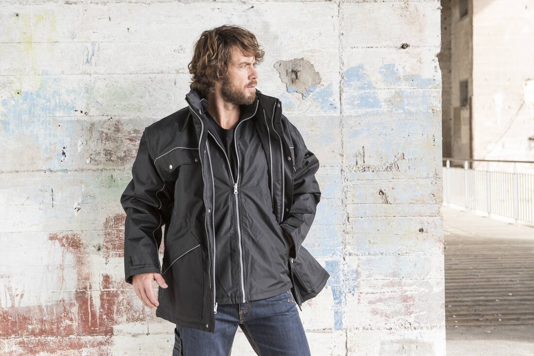Veste de travail 3 en 1. Coupe-vent et imperméable. Passepoil réfléchissant sur le devant et le dos des manches. Capuche passe-montagne dans le col.
