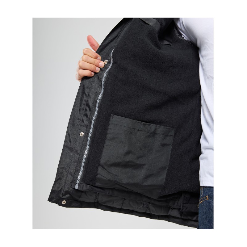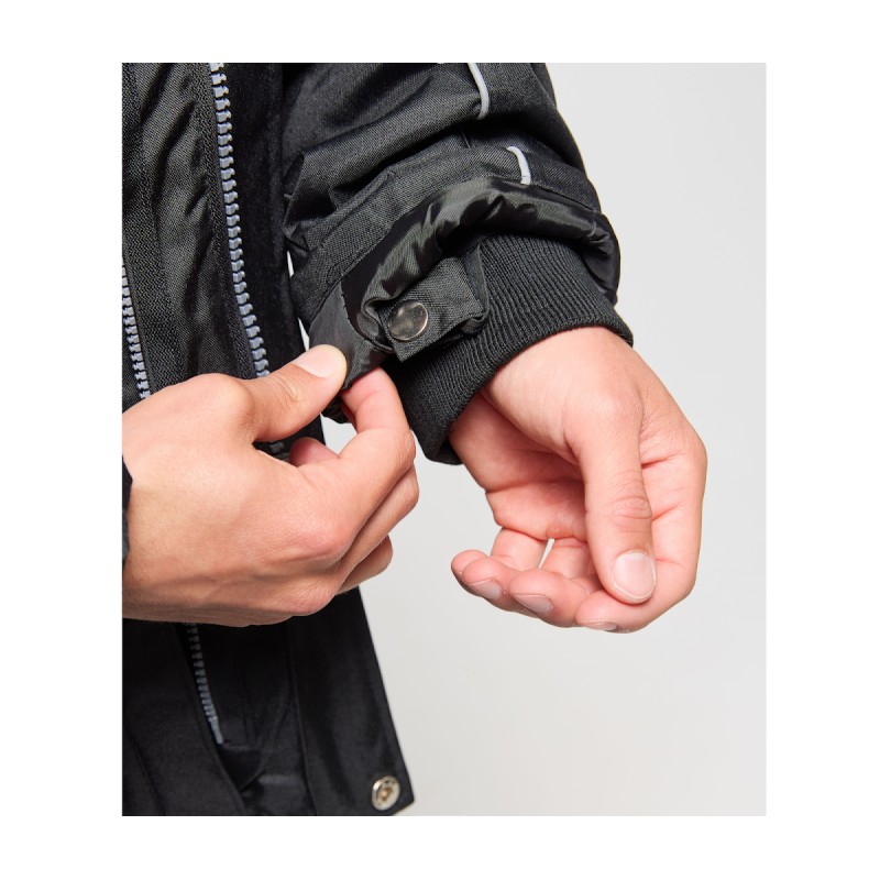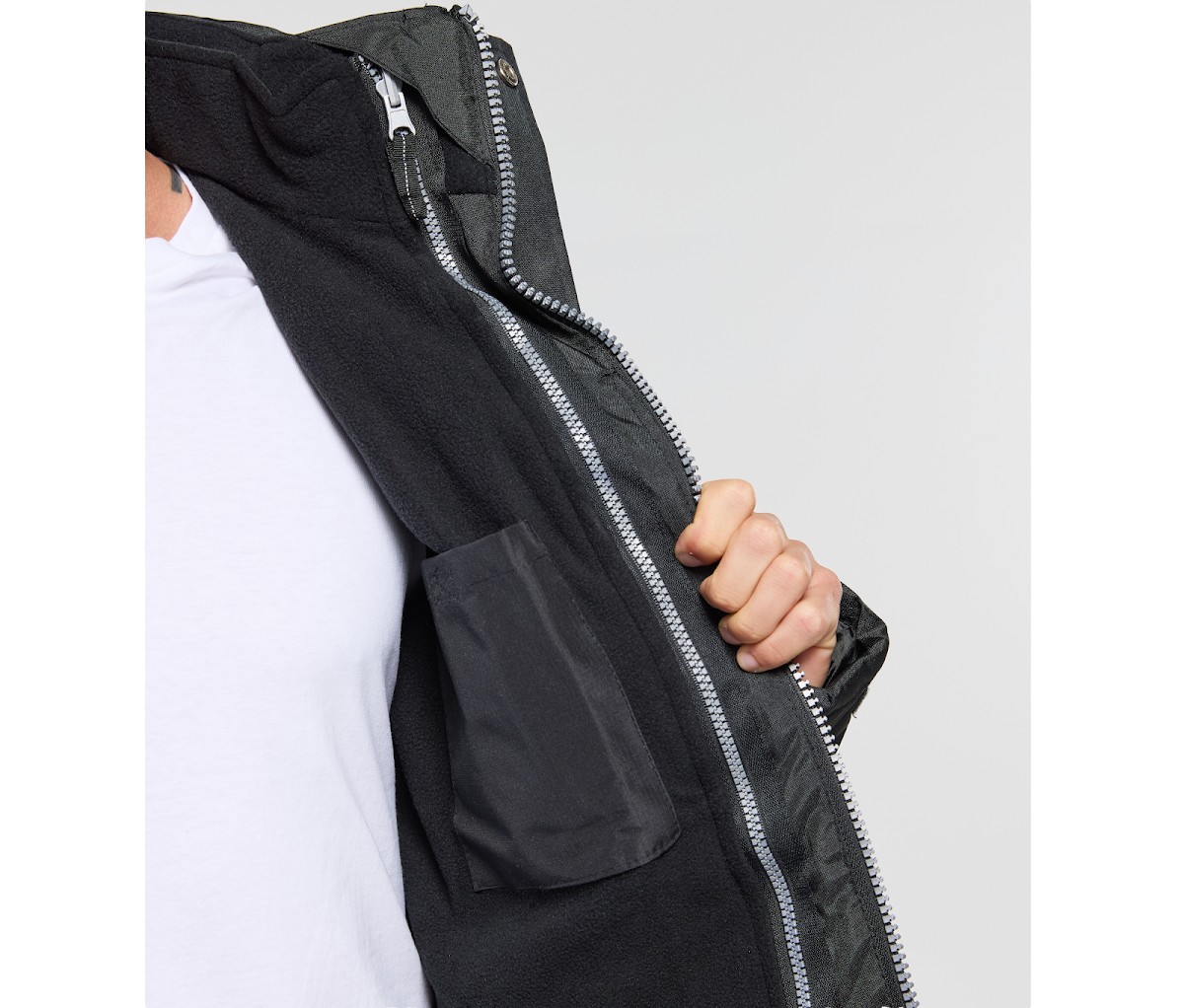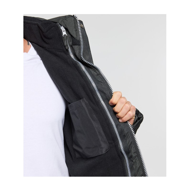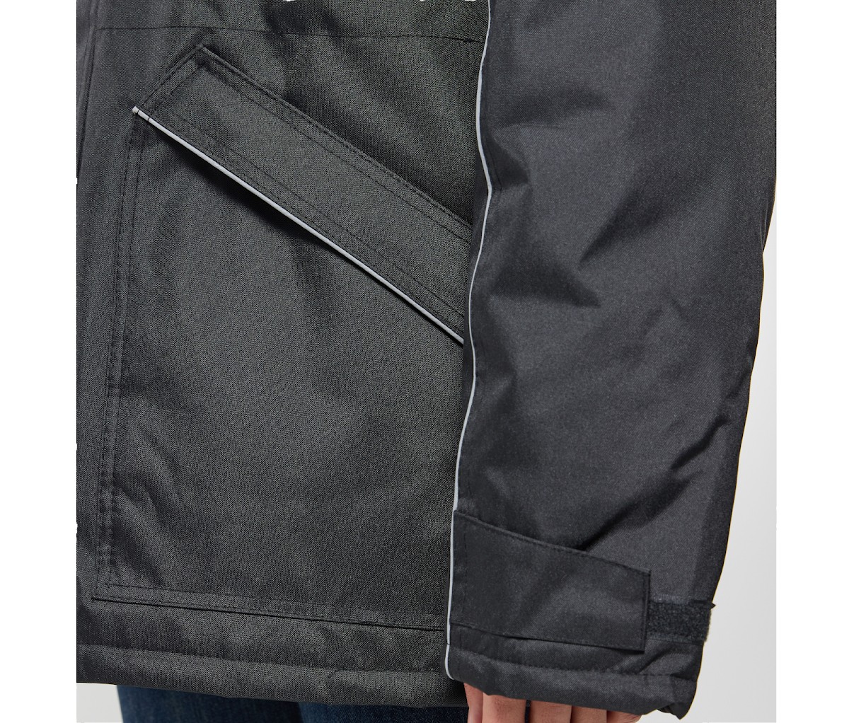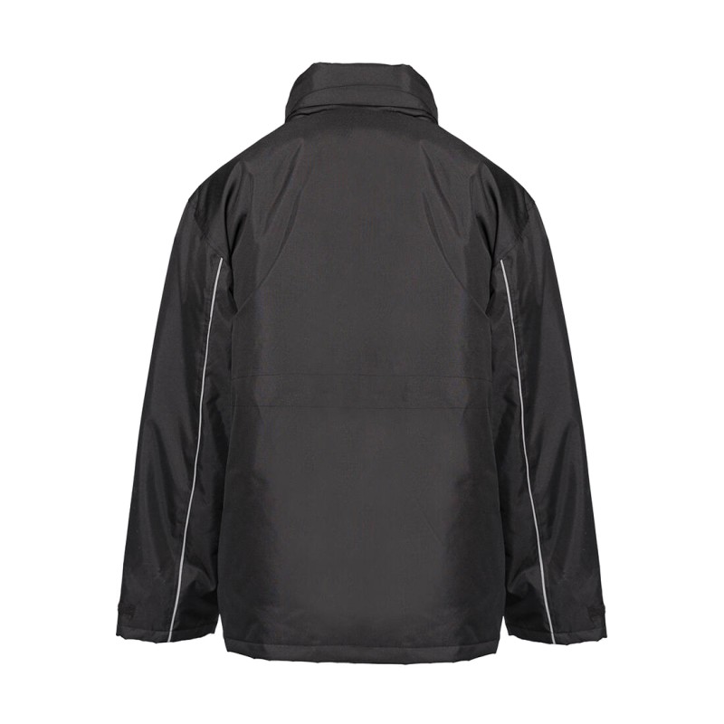 Veste de travail 3 en 1. Coupe-vent et imperméable. Passepoil réfléchissant sur le devant et le dos des manches. Capuche passe-montagne dans le col.