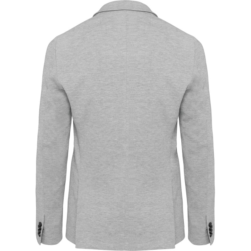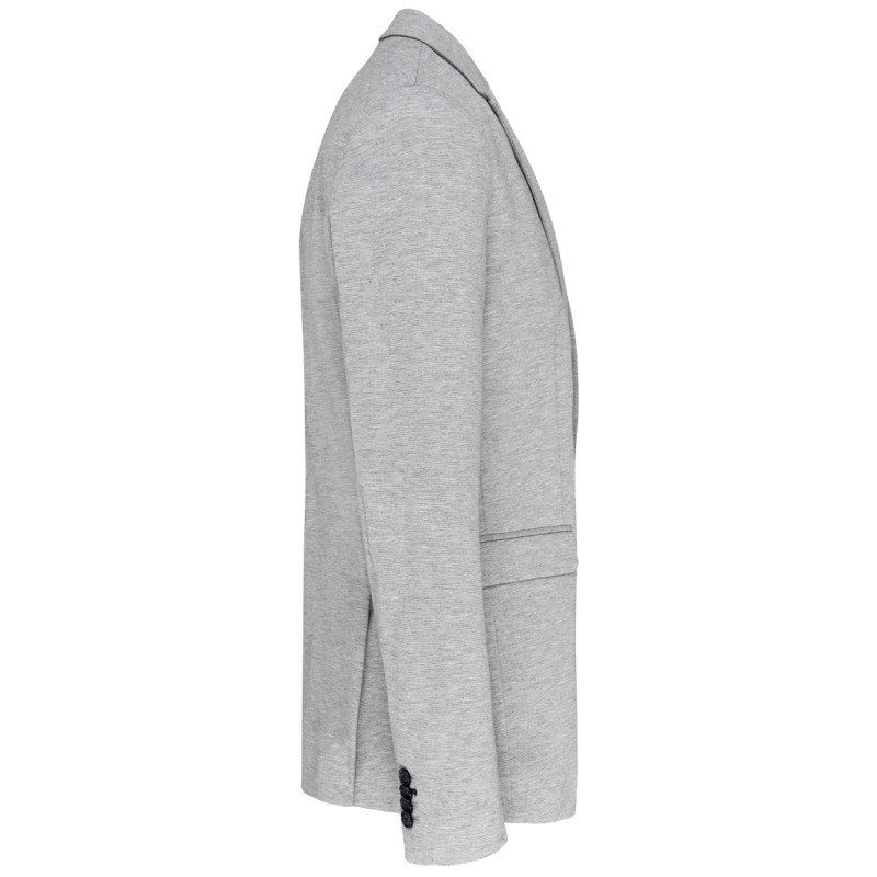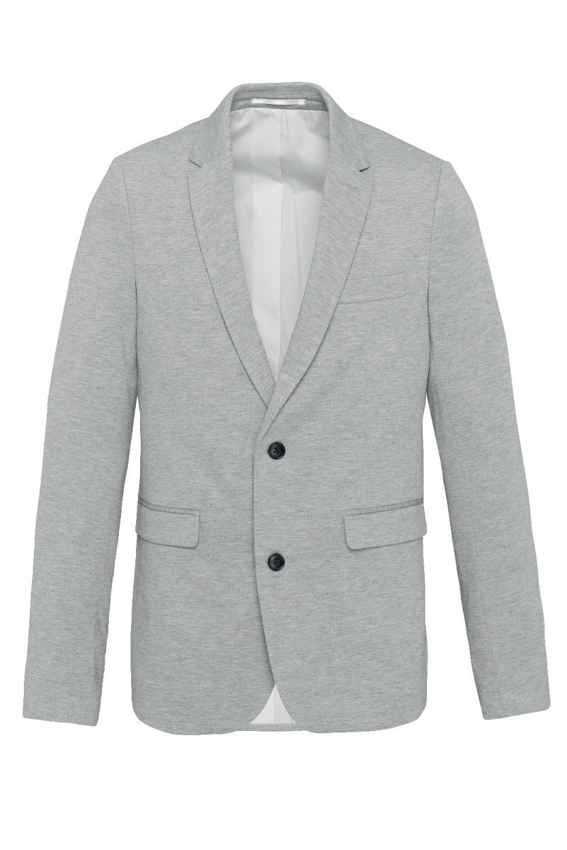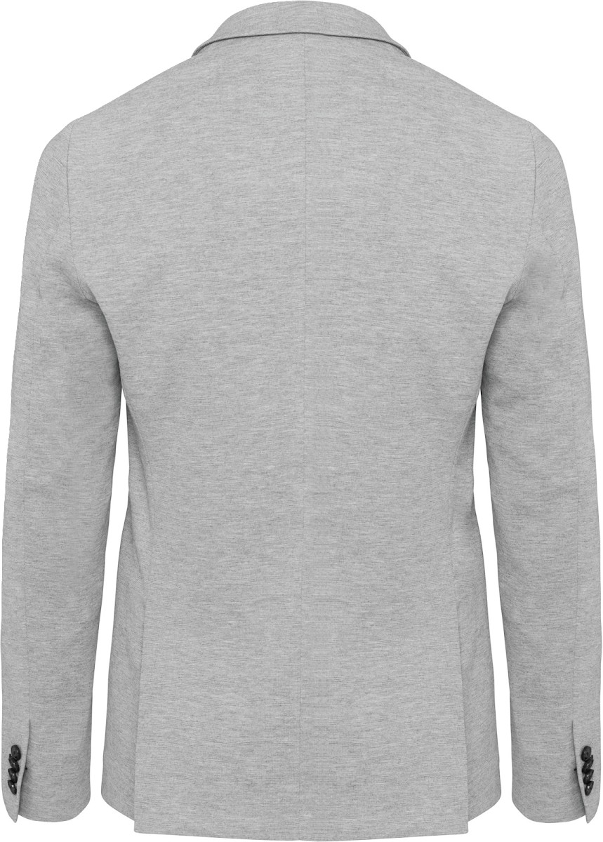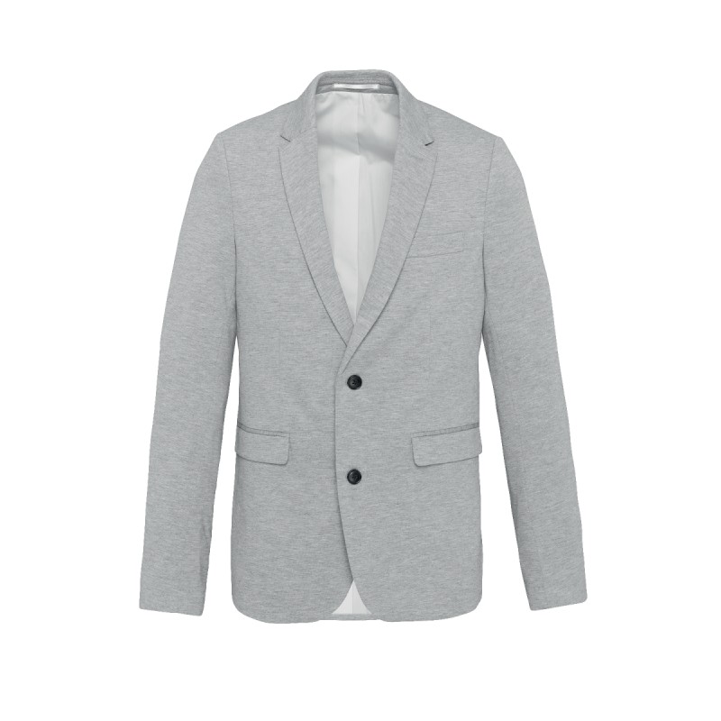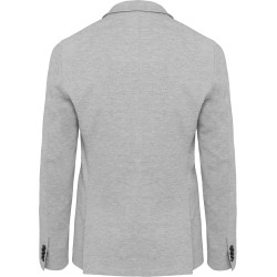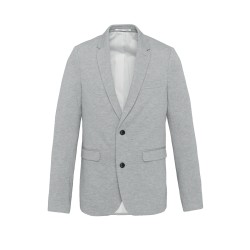 80% polyester / 18% coton / 2% élasthanne (Night navy heather) - 74% polyester / 24% viscose / 2% élasthane (Light grey heather). Maille interlock. Doublure corps en polycoton et manches en taffetas polyester. Veste 2 boutons. 2 poches passepoilées devant avec rabat et une poche poitrine. 2 poches intérieures boutonnées et une poche téléphone. Liseré contrasté intérieur devant. Bas de manches avec 4 boutons dont 1 avec une boutonnière contrastée. 2 fentes d'aisance au dos. 1 zip invisible intérieur côté coeur pour accès personnalisation.