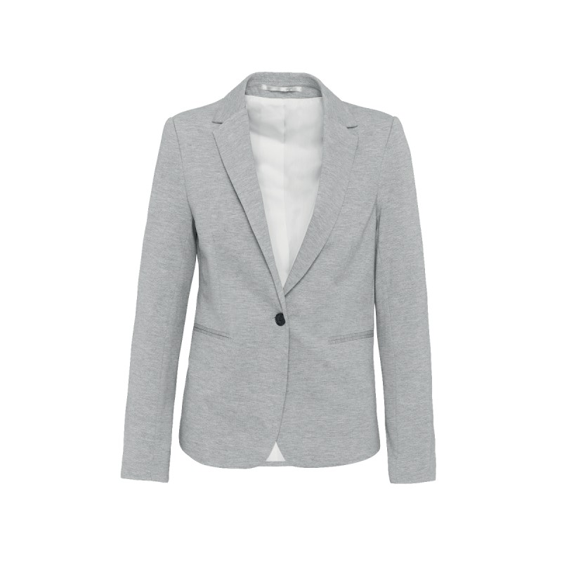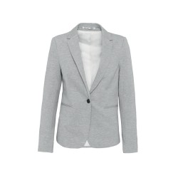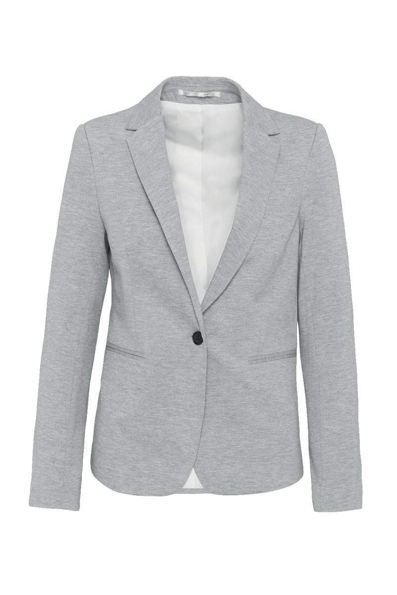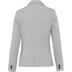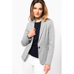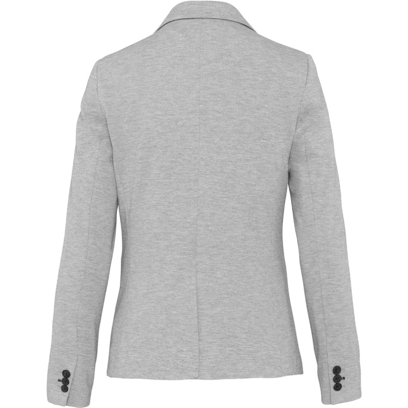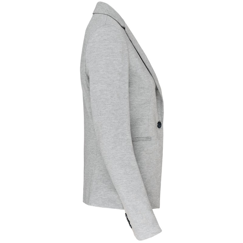 80% polyester / 18% coton / 2% élasthanne (Night navy heather) - 74% polyester / 24% viscose / 2% élasthane (Light grey heather). Maille interlock. Doublure corps en polycoton et manches en taffetas polyester. Veste 1 bouton. 2 poches passepoilées devant. 1 poche intérieure boutonnée. Liseré contrasté intérieur devant. Bas de manches avec 3 boutons dont 1 avec une boutonnière contrastée. 1 fente d'aisance au dos. 1 zip invisible intérieur côté coeur pour accès personnalisation.
