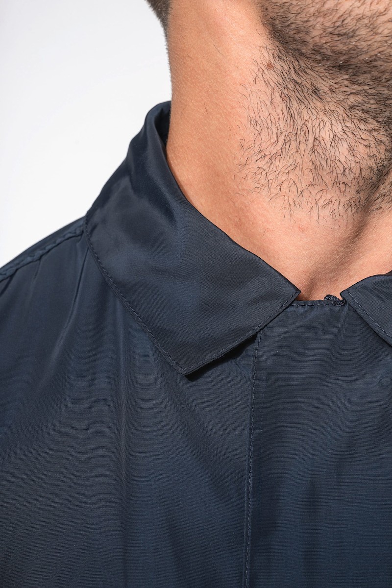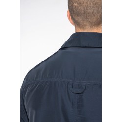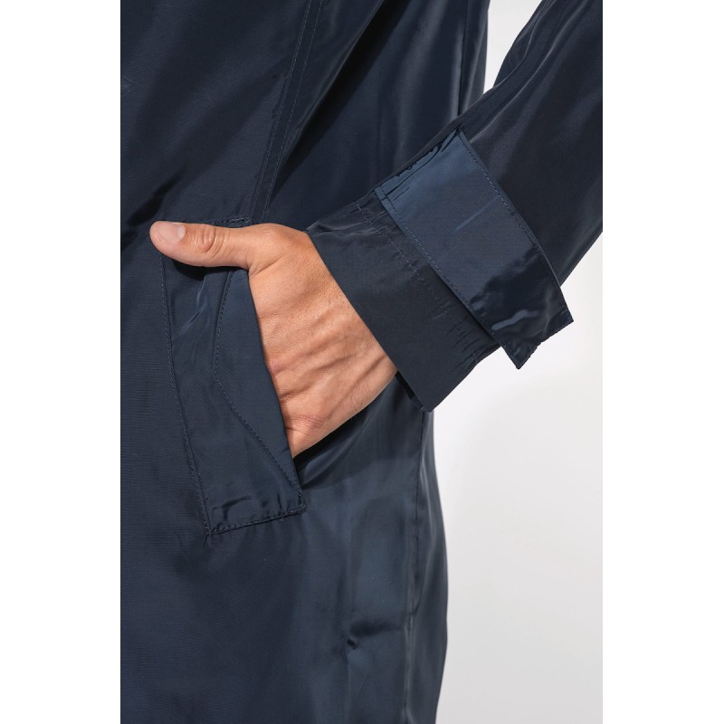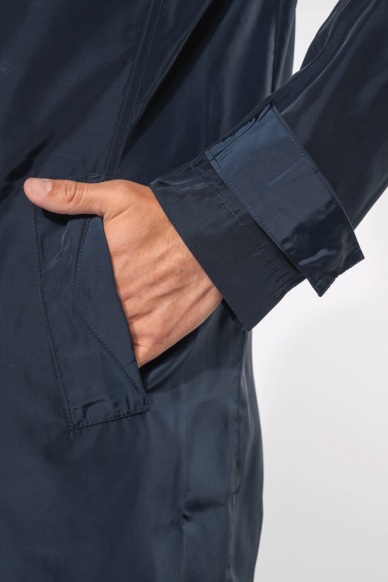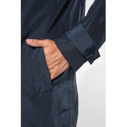100% polyester. Tissu taffetas 320T déperlant. Col chemise. Fermeture zippée en métal cachée par patte et boutons pression. 2 poches côtés fantaisies pressionnées. Doublure sur devant entier et demi dos uniquement. 2 poches intérieures boutonnées et 1 poche pour téléphone portable. Pied de col extérieur et poches intérieures en tissu fantaisie enduit. Patte pressionnée au bas de manches. Zip invisible pour accès personnalisation.