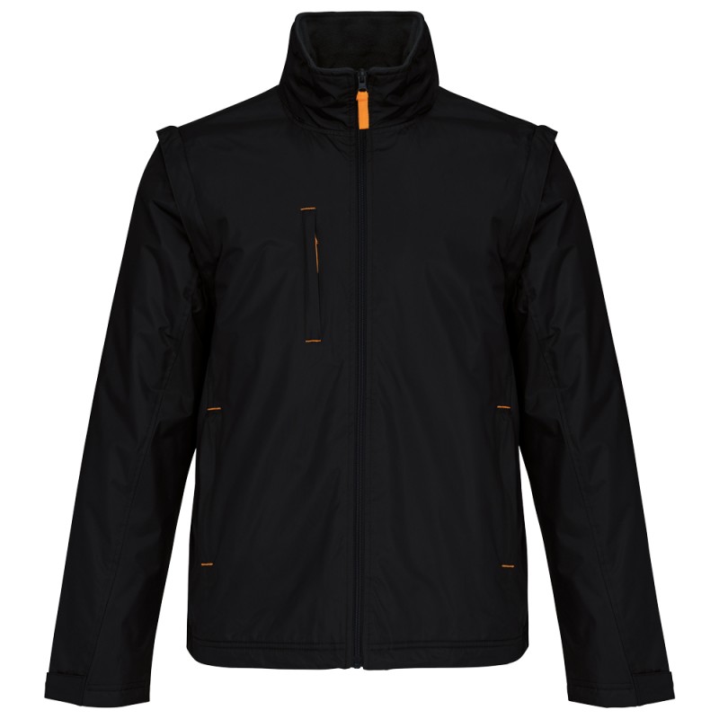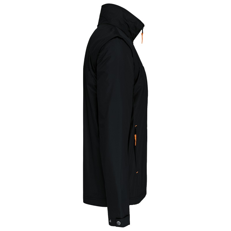 100% polyester avec enduction PVC. Doublure corps en polaire 100% polyester. Tissu souple. Fermeture zippée. 3 poches zippées. Manches amovibles zippées. Patte de serrage au bas des manches. Tirette du zip, tresse encolure et points d'arrêt contrastés. 3 poches intérieures (2 zippées et 1 poche pour le téléphone). Cordon de serrage intérieur contrasté au bas du vêtement. Capuche dans le col. Ouverture zip pour personnalisation.