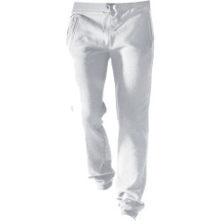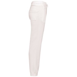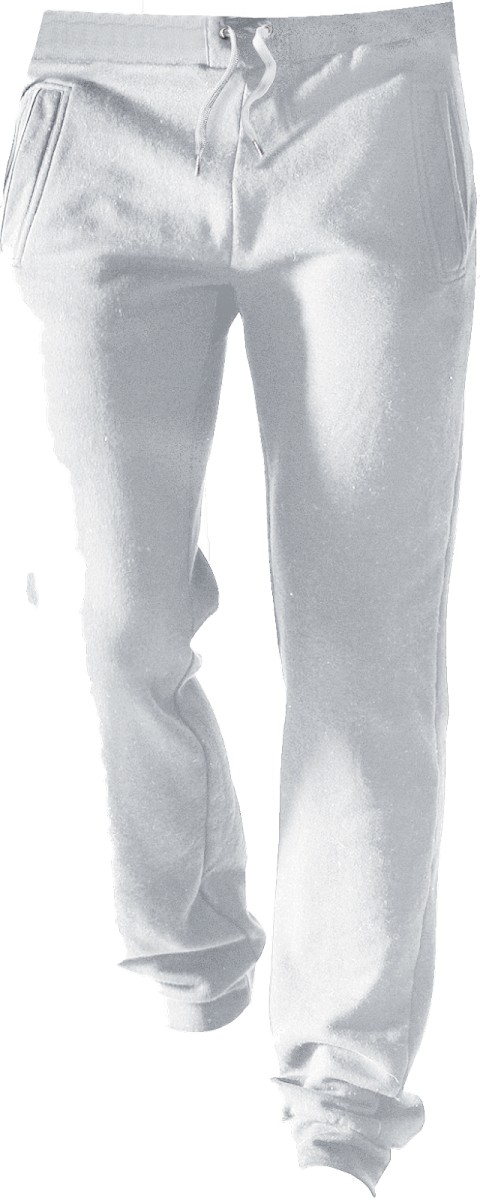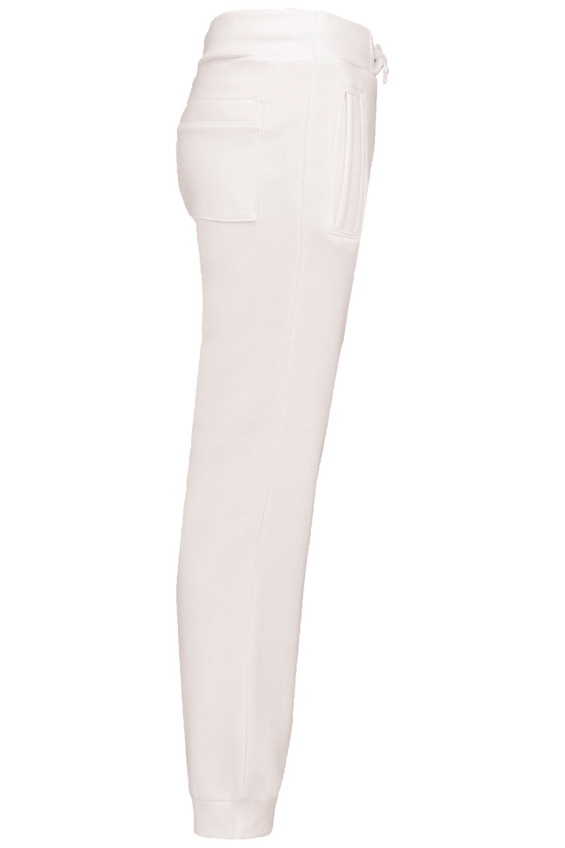 80% coton / 20% polyester. Coton peigné. Molleton gratté. 2 poches côtés et 1 poche arrière plaquée. Large bord-côte et lien de serrage à la taille. Finition bord-côte 1x1 bas de jambe.