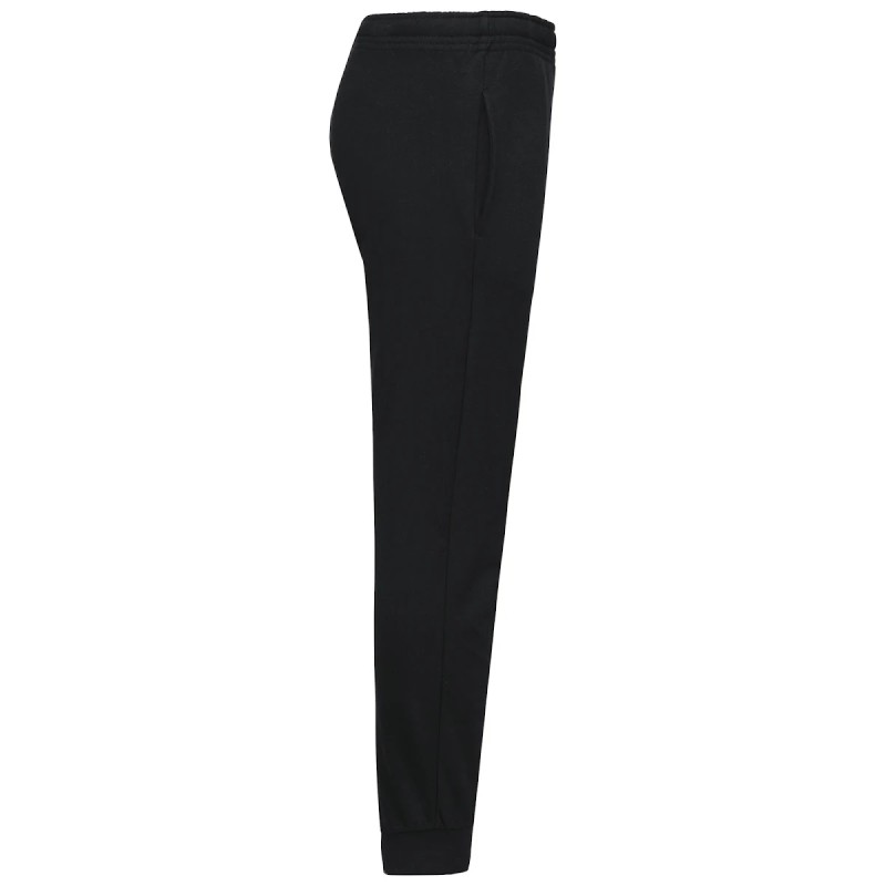 80% coton / 20% polyester. Molleton gratté 2 fils. Coupe droite. 2 poches côtés. Taille élastiquée avec cordon de serrage plat. Bord côtes au bas de jambes.