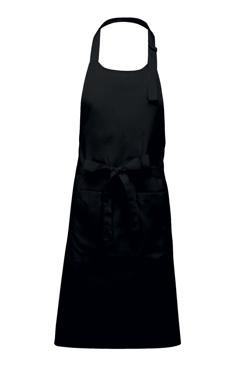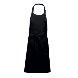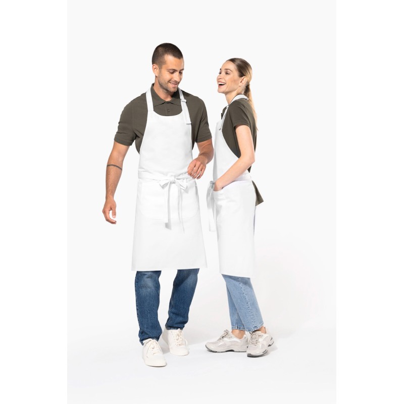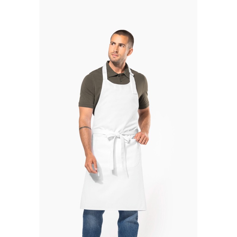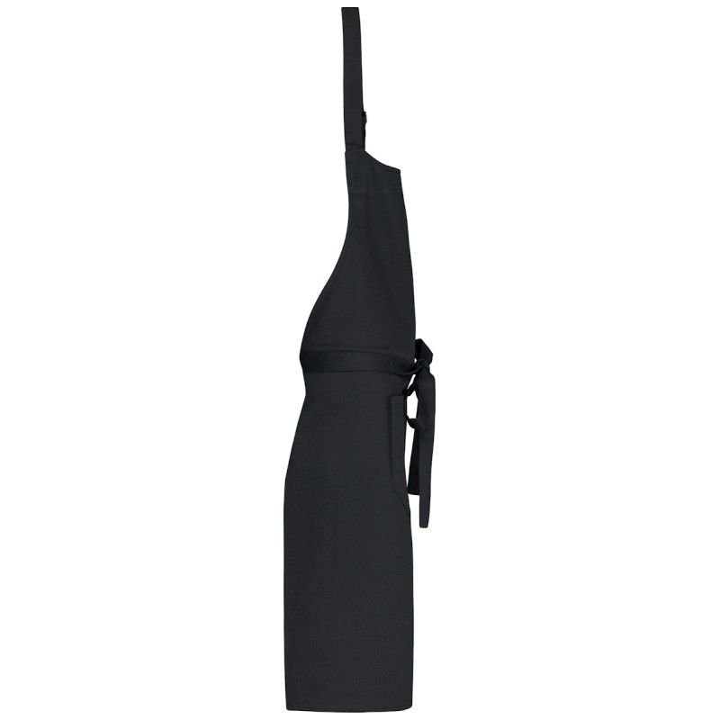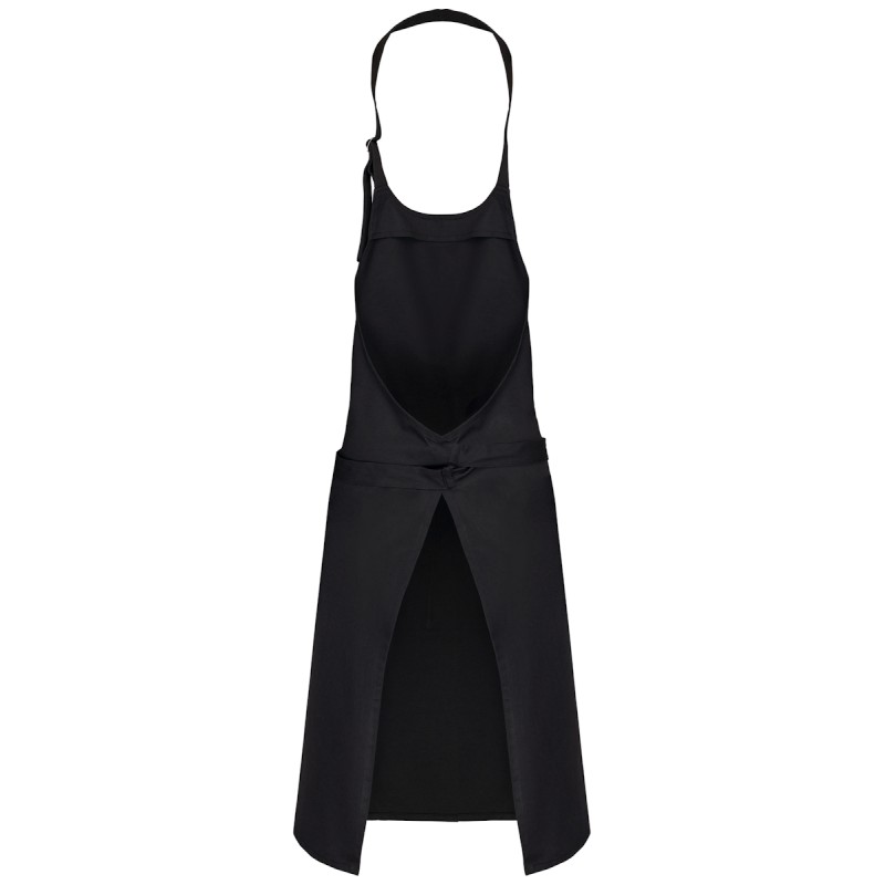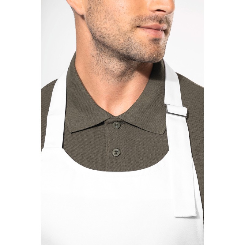 100% coton. Lavage domestique 60°C. Lavage industriel 85°C conforme aux éxigences de la norme ISO15797. Boucle de réglage en métal au niveau du cou pour ajuster la longueur du tablier. Grande poche avant en deux compartiments. Dimensions : H 90 cm - L 76 cm. Poche : H 20 cm - L 31,5 cm.