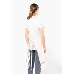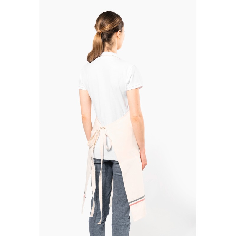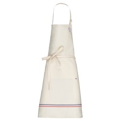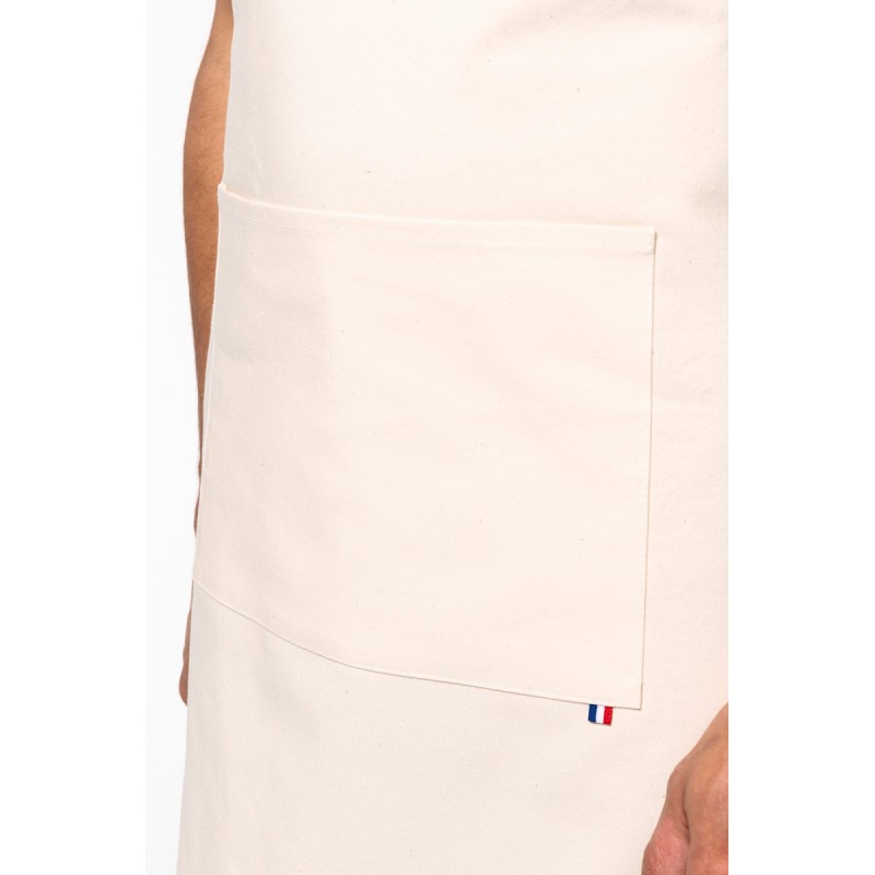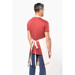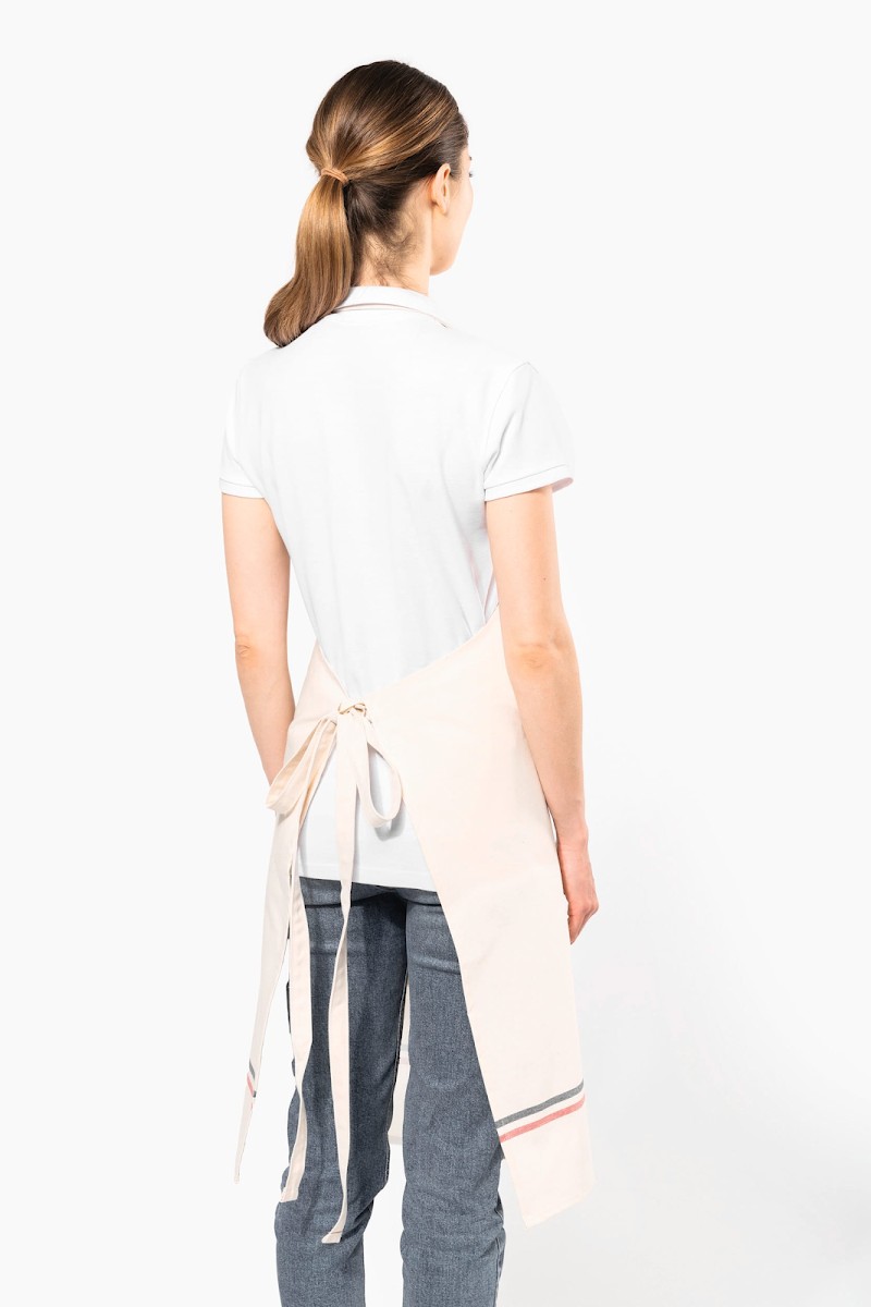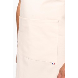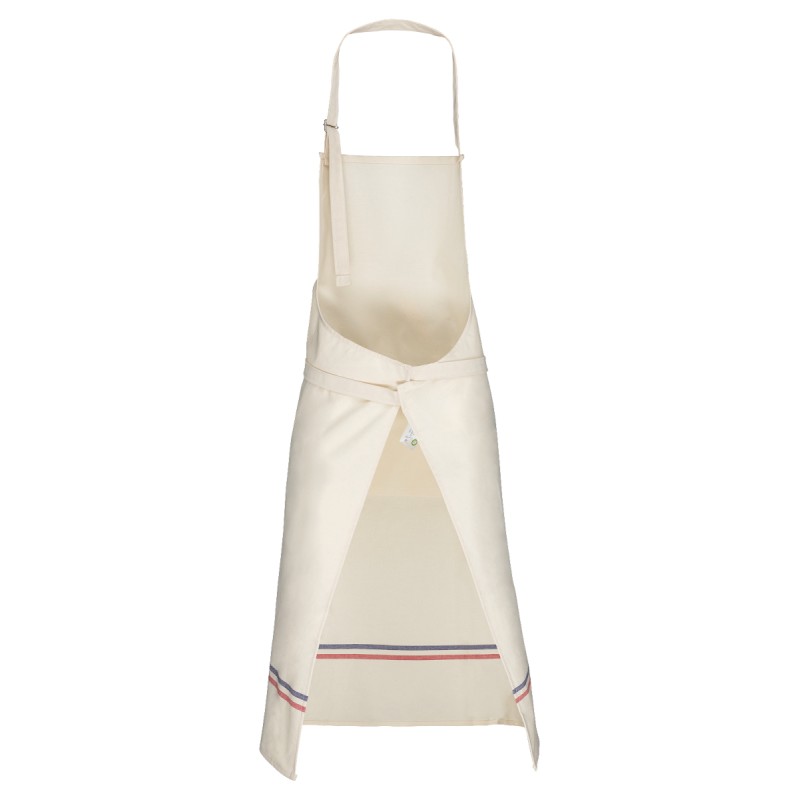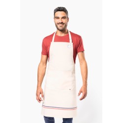 100% coton. Lavage domestique à 60°C. Longueur du tablier ajustable grâce à une boucle de réglage en métal au niveau du cou. Grande poche à l'avant. Motif 2 bandes dans le bas du tablier. Lanière réglage col . Étiquette tissée drapeau France sur la poche avant. Dimensions : H 91 cm x L 78 cm. Poche : H 21 cm x L 31 cm. Label "Origine France garantie. Fabriqué en Bretagne"