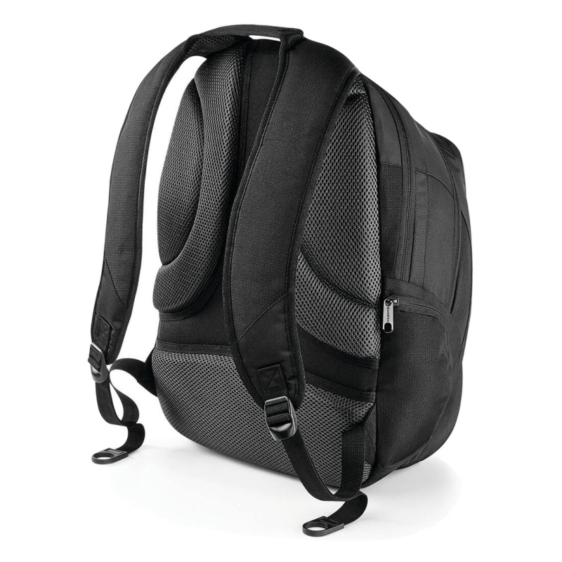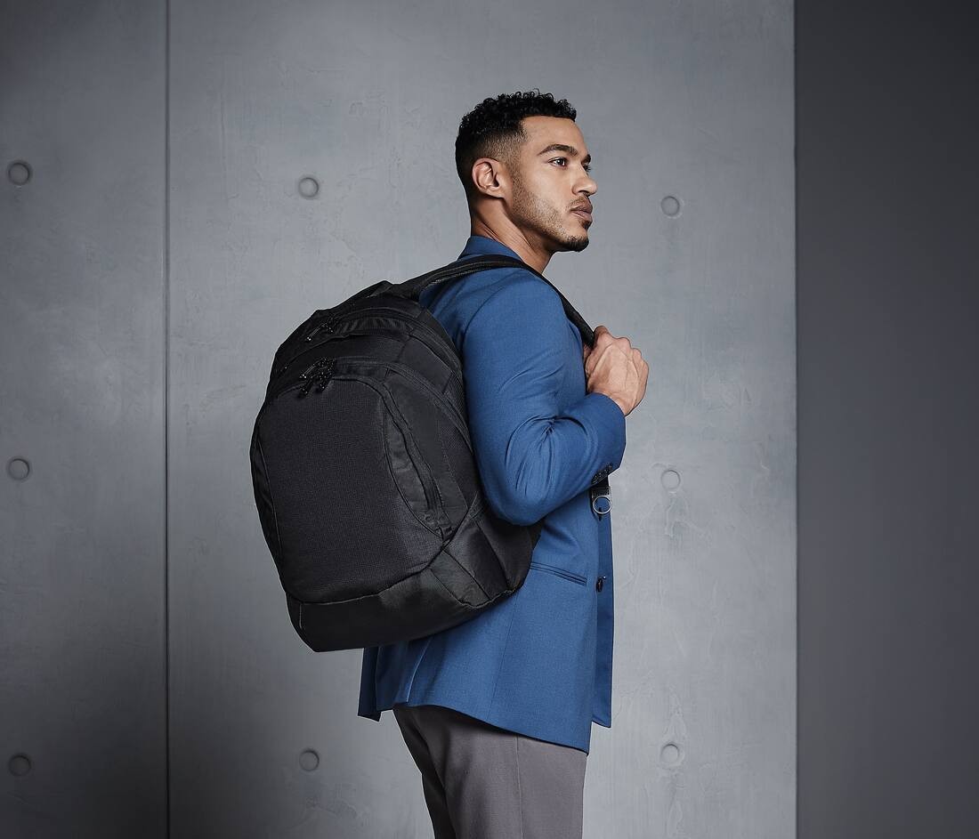 Polyester 600D Micro Rip-Stop | Bretelles réglables rembourrées | Dos rembourré ergonomique | Multiples poches internes | Compartiment à ordinateur portable rembourré, section documents, poche avant section organisateur | Convient à des ordinateurs portables jusqu’à 15,6" | Poches média verrouillables | Compartiment à chaussure/poche pour objet humide | Capacité : 26 litres | Livraison sans contenu/décoration