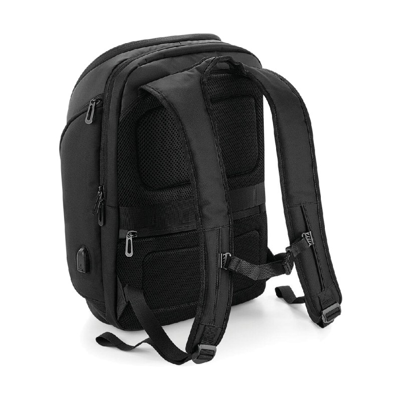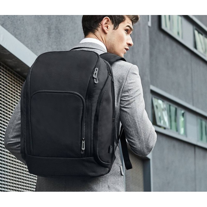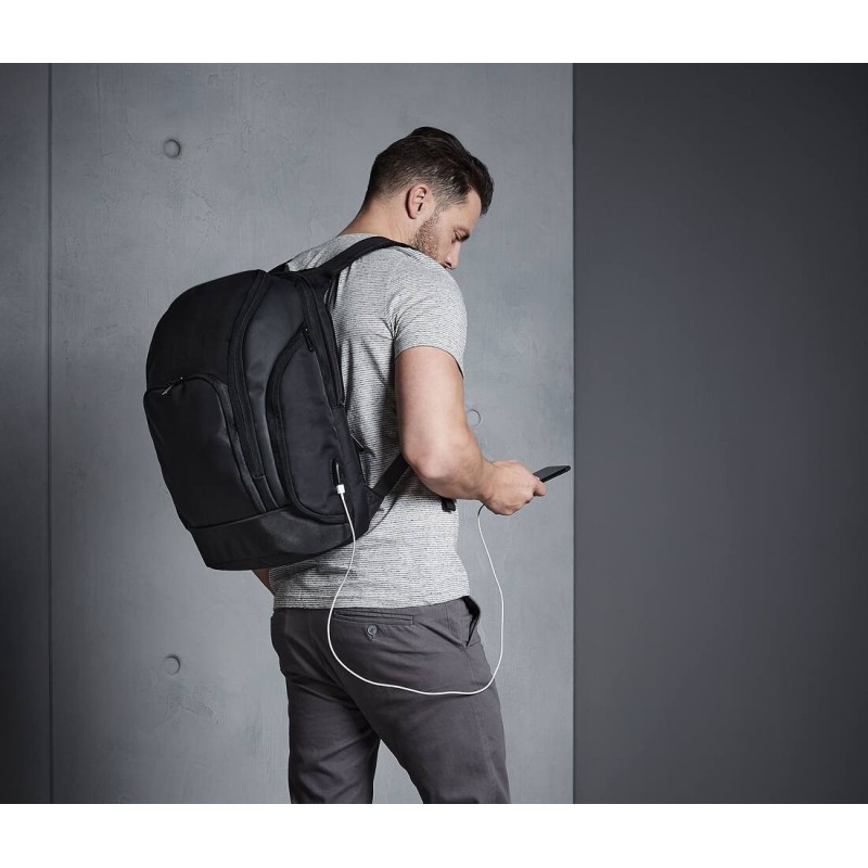 Mélange de Nylon Jacquard et de Polyester enduit | Étiquette détachable pour faciliter le remarquage | Convient à des ordinateurs portables jusqu'à 17 po | Compartiment matelassé pour ordinateur portable avec accès exterieure | Compartiment intérieur rembourré pour tablette | Poche arrière discrète à fermeture éclair | Compartiment avant de rangement | Poche pour powerbank (chargement media) | Port de chargement USB intégré | Port élastique pour media | Porte-clés | Poches internes zippées | Poches latérales à glissière | Sangles poitrine ajustables | Grande capacité | Bandoulière pour sac | Dos rembourré ergonomique | Bretelles réglables rembourrées | Livraison sans contenu/décoration | Capacité : 25 litres