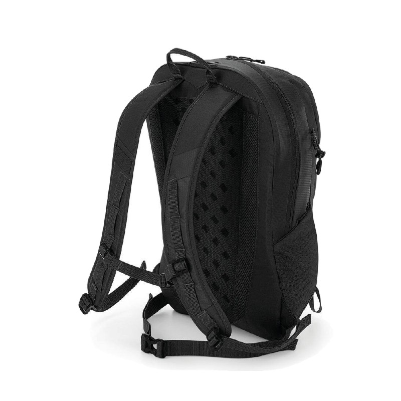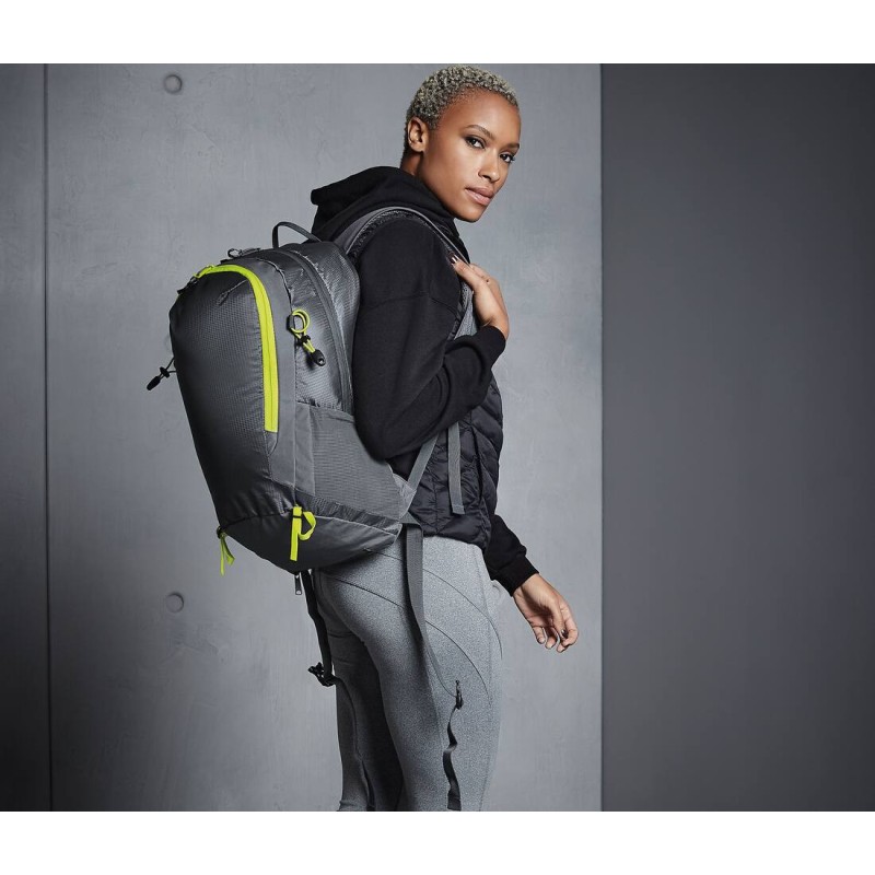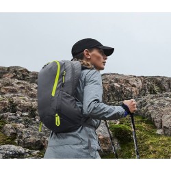 Mélange de Polyester Armuré 210D et de Polyester 300D | Étiquette détachable pour faciliter le remarquage | Ultra-léger mais durable | Compatibilité avec réservoir d'hydratation (poche à eau) | Points de fixation des bâtons de trekking | Résistant à l'eau | Housse de protection contre la pluie imperméable et amovible | Poche avant zippée | Poche intérieure | Poches internes zippées | Porte-clés | Poches latérales élastiques en maille filet | Panneau arrière ventilé en mesh | Bretelles réglables rembourrées | Sangles ajustables au niveau des hanches et de la poitrine | Accents réfléchissants | Poignée | Livraison sans contenu/décoration | Capacité : 25 litres
