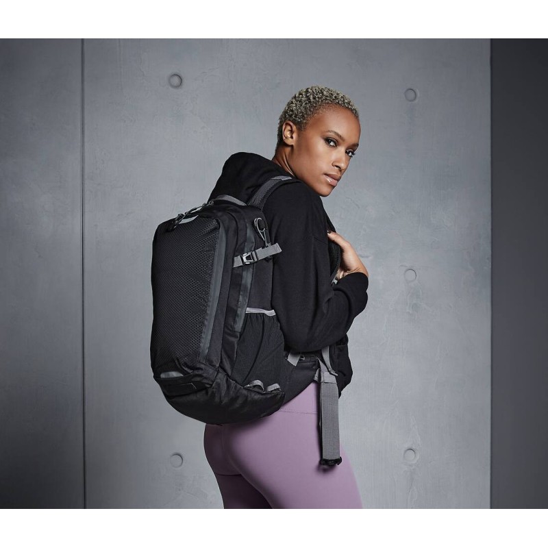 Mixte de polyester 600D/Ripstop en nids d'abeilles | Housse de protection contre la pluie imperméable et amovible | Convient à des ordinateurs portables jusqu'à 15,6 po | Bretelles réglables rembourrées | Sangles ajustables au niveau des hanches et de la poitrine | Partie dorsale respirante et ergonomique avec empiècement en résille | Compatibilité avec réservoir d'hydratation (poche à eau) | Points de fixation des bâtons de trekking | Poignées renforcées/tissées | Poches latérales élastiques en maille filet | Poches latérales à glissière | Poche intérieure en résille | Accents réfléchissants | Sangle d'épaule rembourrée et ajustable | Poignée | Étiquette déchirable | Capacité : env. 20 litres | Livraison sans contenu/décoration
