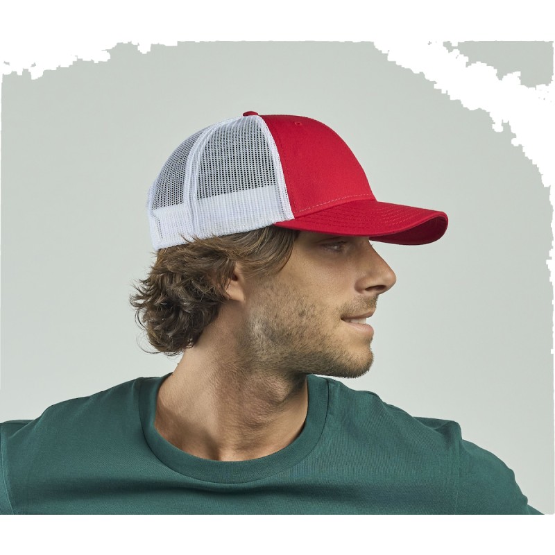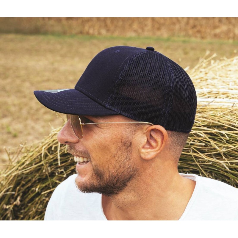 Recy Three est le nouveau défi qui allie coton classique et recyclé, en ajoutant mesh et fermeture en polyester recyclé.. 6 PANNEAUX, Cotton, MID VISOR, oeillets surpiqués, 6 COUTURES SUR LA VISIERE. Main fabric: 100% coton_x000D_