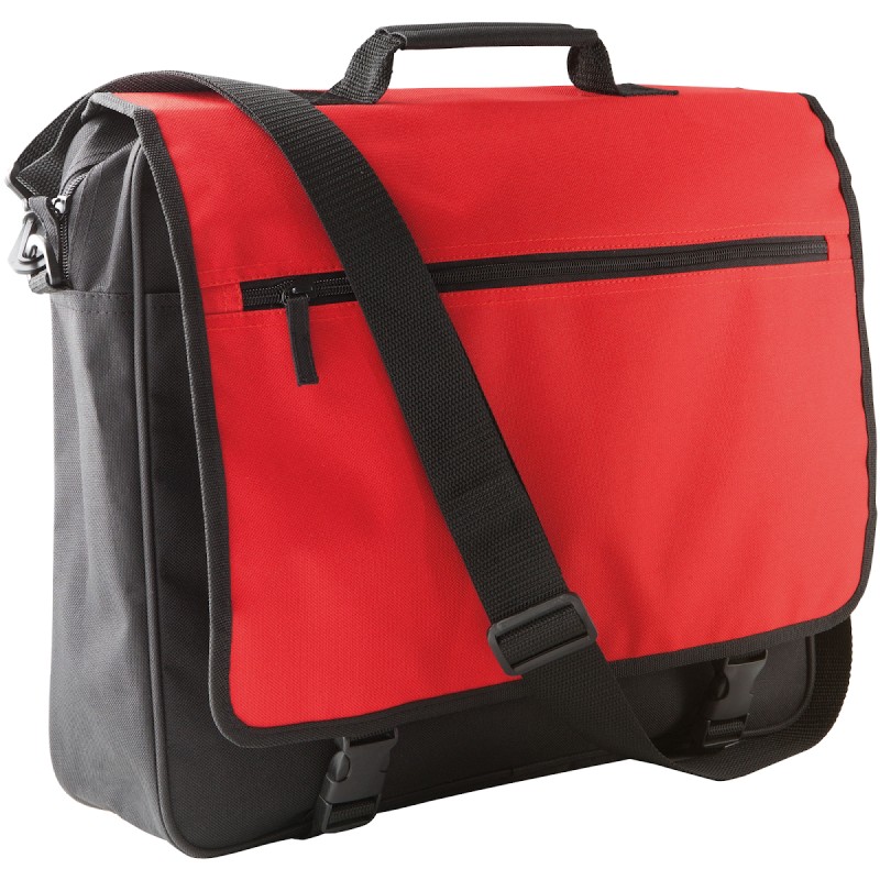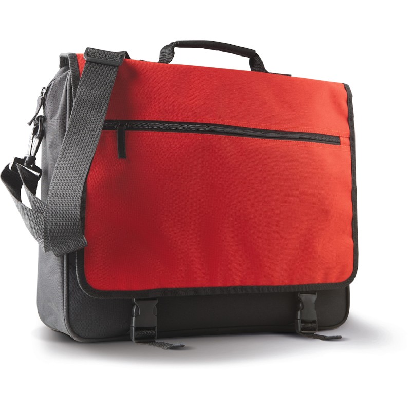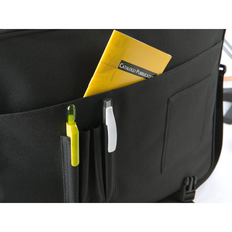 Porte-document en polyester 600D, rabat avec poche devant et boucle de fermeture, poche intérieure multifonction, bandoulière amovible et ajustable.